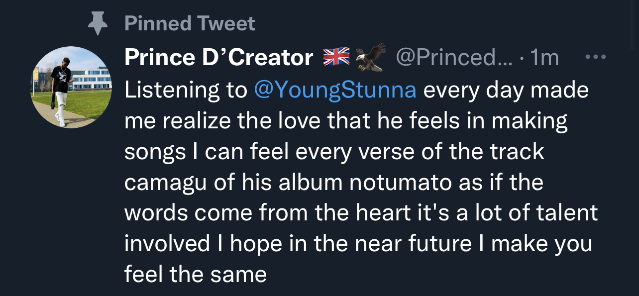 Johannesburg, Gauteng May 12, 2022 (Issuewire.com) - This week Prince D'Creator used his Twitter account “@princedcreator” to praise the inspiration behind his debut vocal song in a post the young artist wrote "Listening to @Young Stunna every day made me realize the love that he feels in making songs I can feel every verse of the track camagu of his album notumato as if the words come from the heart it's a lot of talent involved I hope in the near future I make you feel the same " thus making it clear that Young Stunna is one of his great inspirations