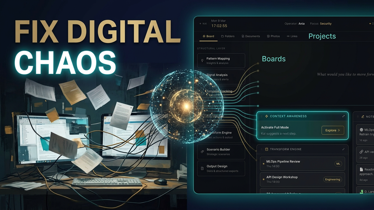 KaiSpace is not a chatbot. It is private intelligence infrastructure: a workspace where multiple AI engines can be orchestrated under one intentional framework — built to reduce noise, surface risk, and keep context intact so insight can compound instead of resetting.