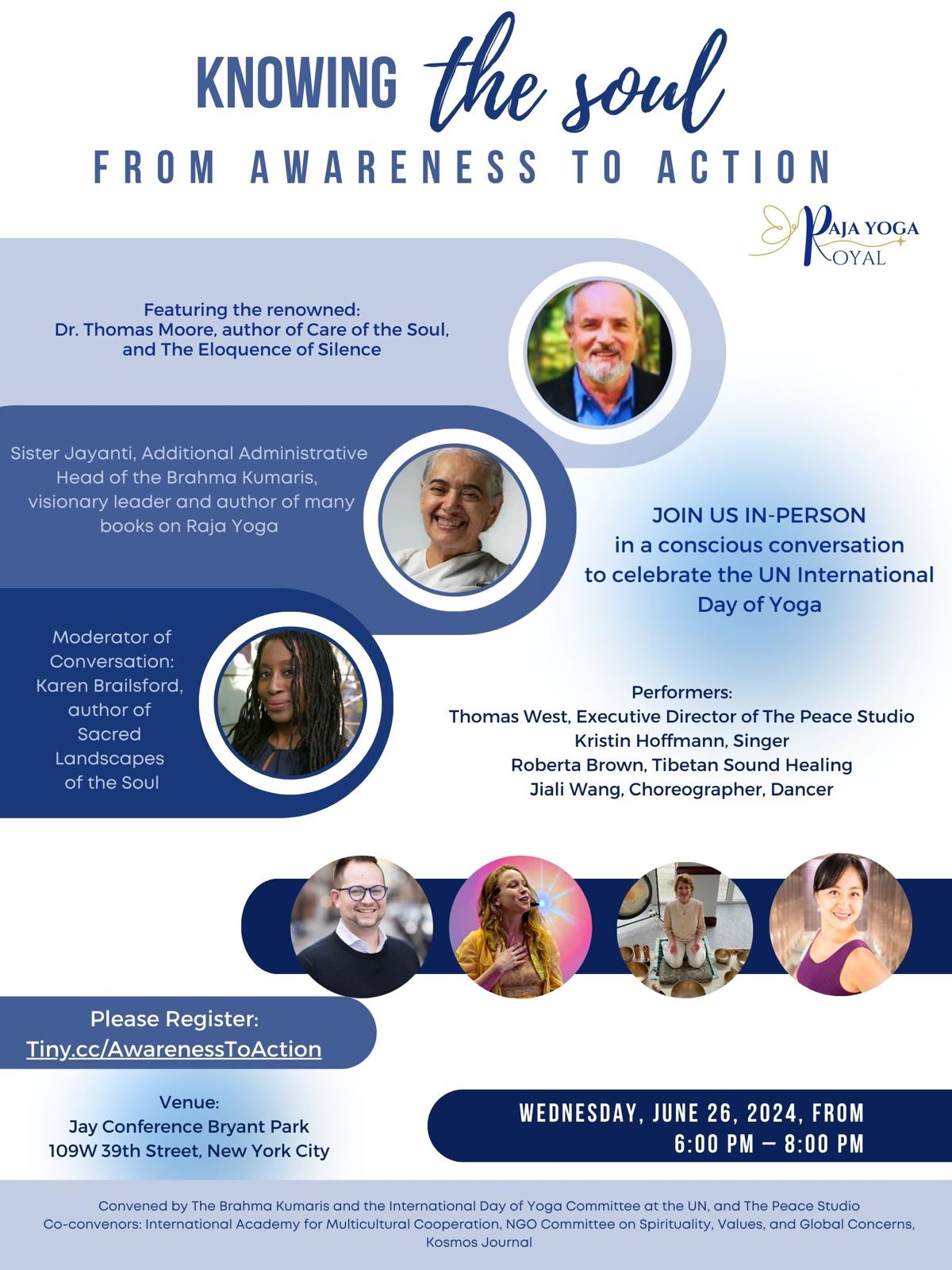 Dr. Thomas Moore, best-selling author of Care for the Soul and Sister Jayanti, international speaker, author and Additional Head of The Brahma Kumaris will share a stage on the evening of June 26 at Bryant Park. The interview and conversation will be moderated by Karen Brailsford, herself an author of Sacred Landscapes of the Soul. Live music and dance including by Juilliard alumnus vocalist Thomas West.