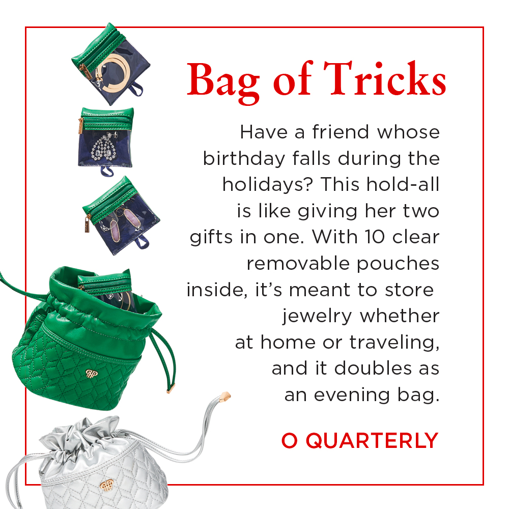 As Oprah says on OprahDaily.com, “Have a friend whose birthday falls during the holidays? This hold-all is like giving her two gifts in one. With 10 clear removable pouches inside, it’s meant to store jewelry whether at home or traveling, and it doubles as an evening bag.”