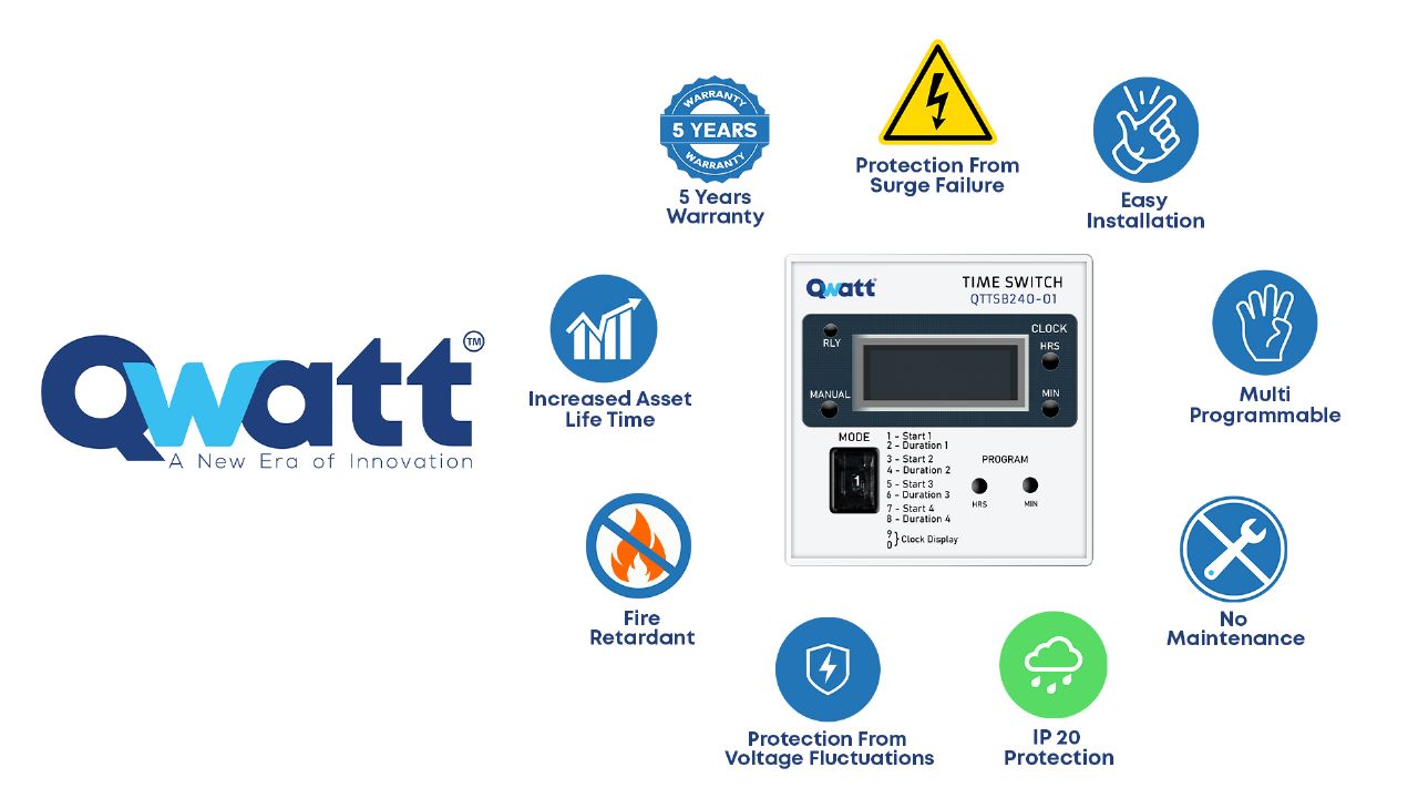 Recent strides have culminated in the launch of our cutting-edge time switch, infused with advanced technology. This offering boasts four distinct output options alongside versatile programmability, enabling the connection of multiple equipment units to a singular time switch, each with its own personalized time setting. While Qwatt's primary focus has been on automating signage lighting, this novel time switch elevates automation to an advanced level, extending its capabilities to a wide array of electrical and electronic devices. The introduction of this time switch carries significant implications across various sectors, encompassing banking, petroleum, automotive, retail, FMCG, NBFC, airports, manufacturing industries, outdoor streetlight projects, hotels, the service industry, stadiums, and railway stations. With the ability to automate a multitude of devices with diverse time settings, Qwatt's time switch directly addresses the longstanding challenge of implementing automation within these sectors, often constrained by financial considerations.