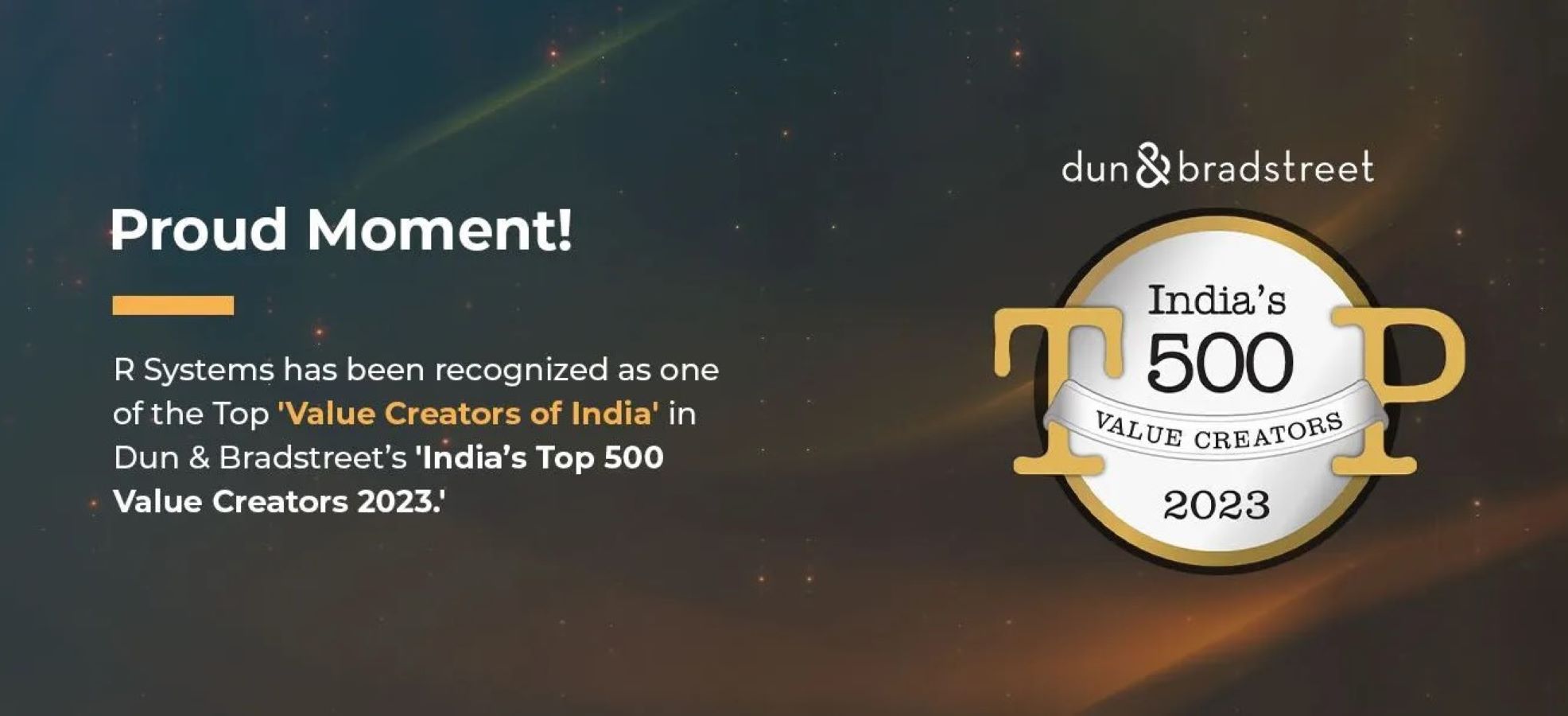 For over two decades, Dun & Bradstreet India has been compiling an annual list of India's Top 500 Companies, representing nearly 60 sectors. This year, the focus has been extended to honor the ‘Value Creators’ - companies that have demonstrated significant market value creation and intrinsic value creation in the past five financial years (FY 2019 – FY 2023). R Systems International Limited has been recognized for its outstanding performance across more than 25 evaluation parameters.