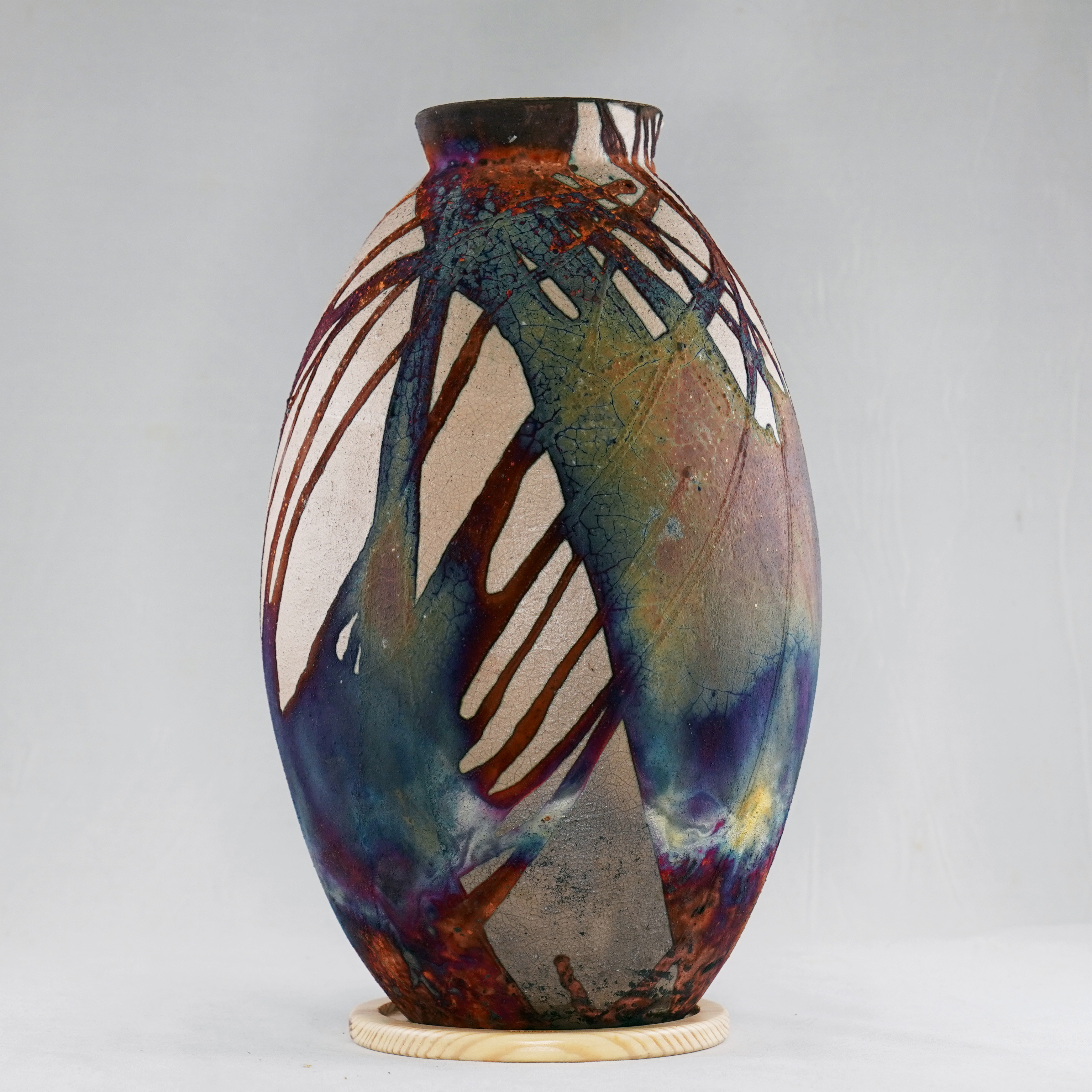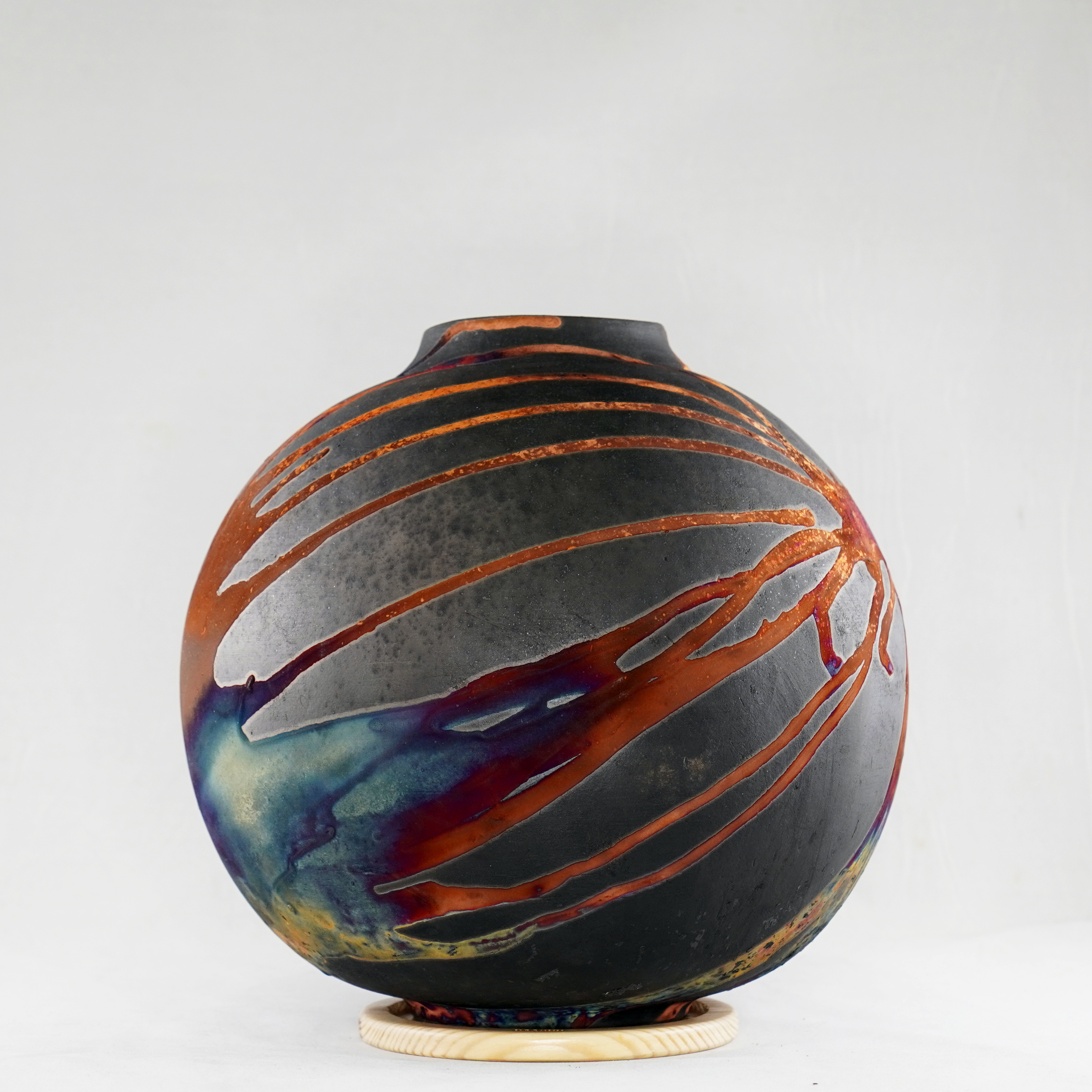 Raku ceramics are special because of the unpredictability of the Raku firing technique. Raku firing is done in an extremely hot kiln and then removed while the ceramic piece is still red-hot or molten. Immediately after coming out of the kiln, the ceramic piece is then placed in a reduction chamber – usually a simple metal bin or container – filled with sawdust or paper. The extreme heat from the ceramic piece then ignites the combustible material in the reduction chamber, which is then sealed for a while. What happens inside the reduction chamber next is the key to the unique and unpredictable colors and patterns of each raku ceramic piece. This makes each ceramic piece one-of-a-kind – no two pieces can be the same.