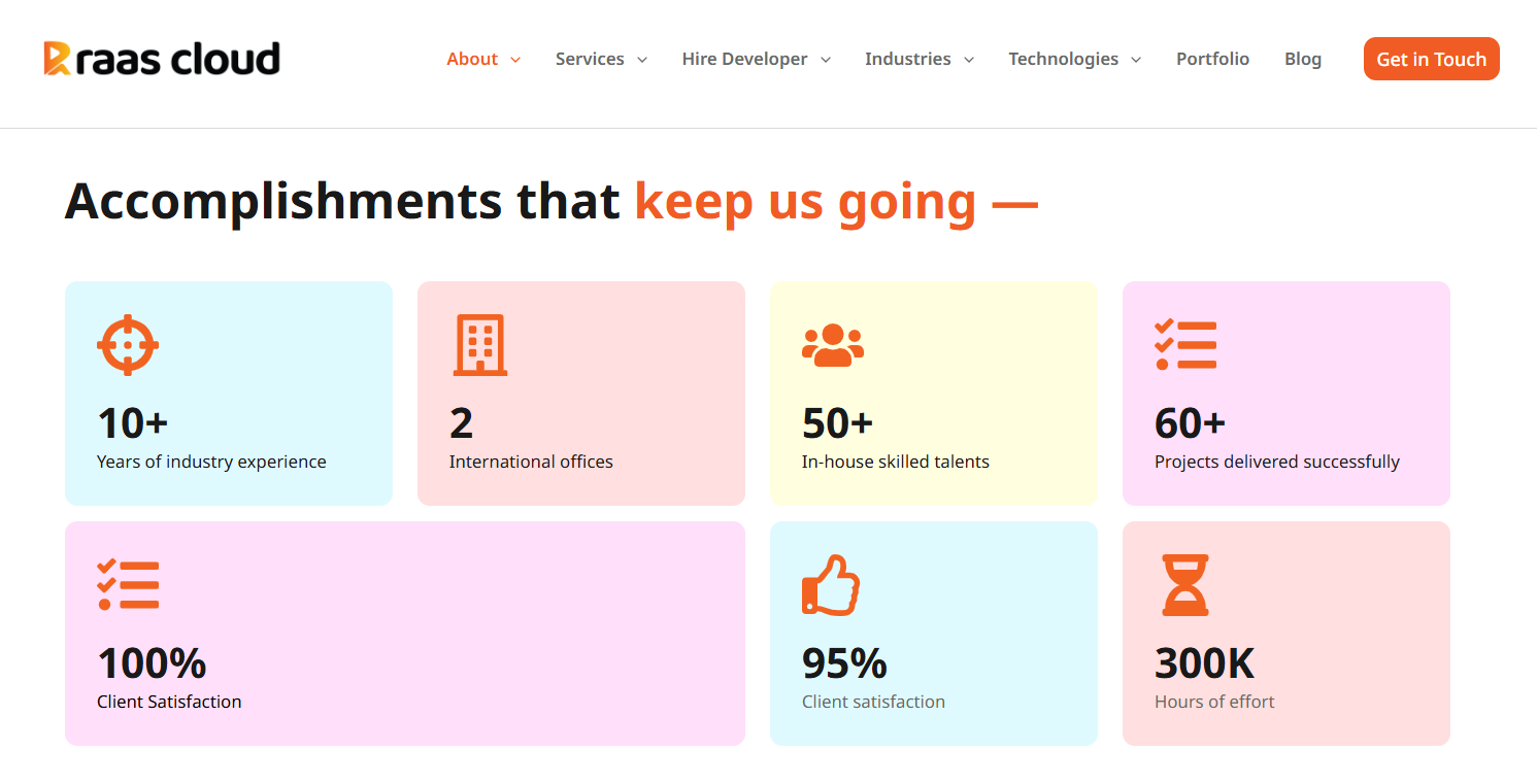 RAAS Cloud has built a strong foundation of reliability and excellence by completing over 300,000 hours of successful delivery for clients across multiple industries, including healthcare, finance, education, retail, real estate, and travel. With a team of 50+ highly skilled professionals, the company combines domain expertise with modern technologies to craft secure, scalable, and performance-driven software systems.