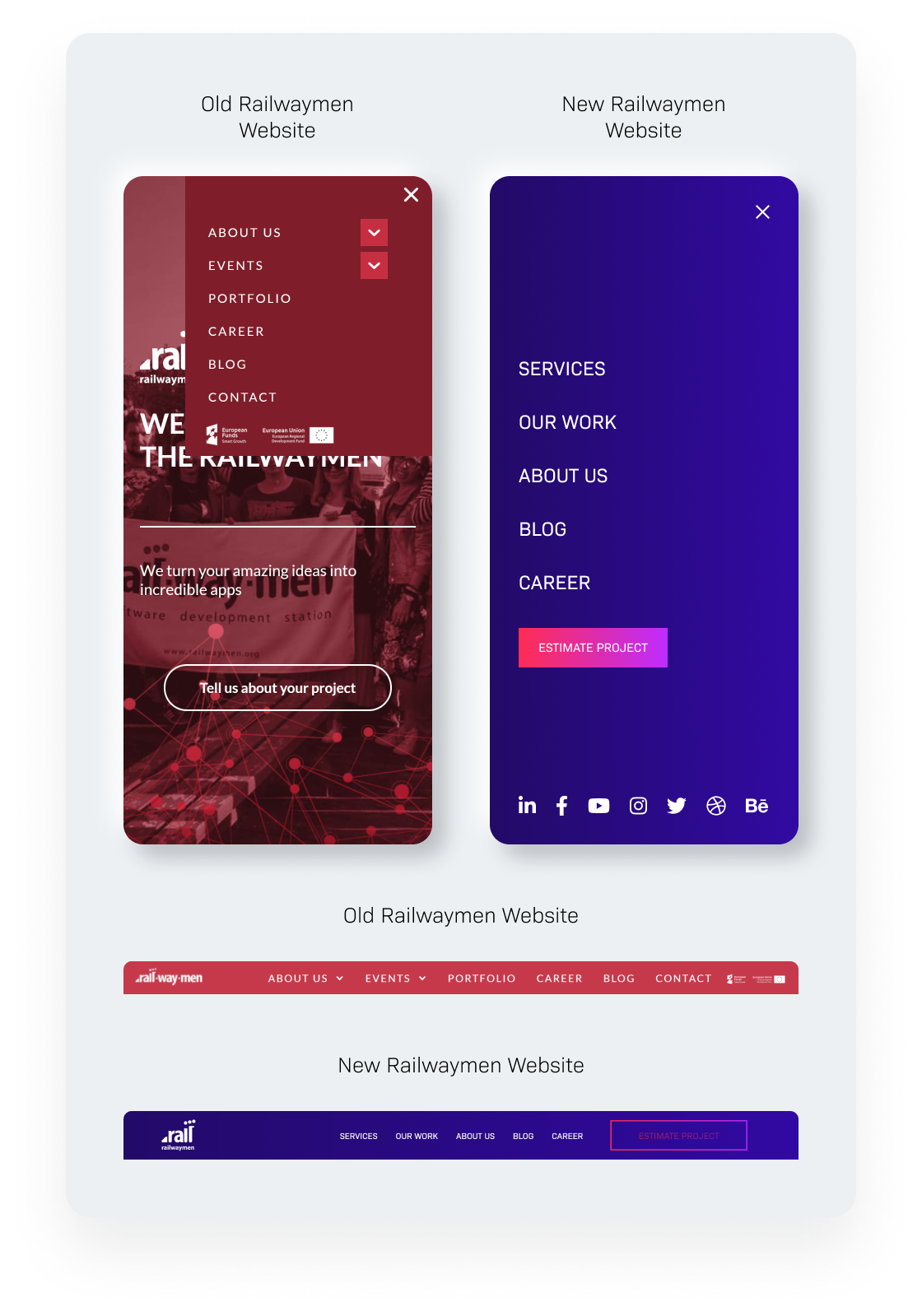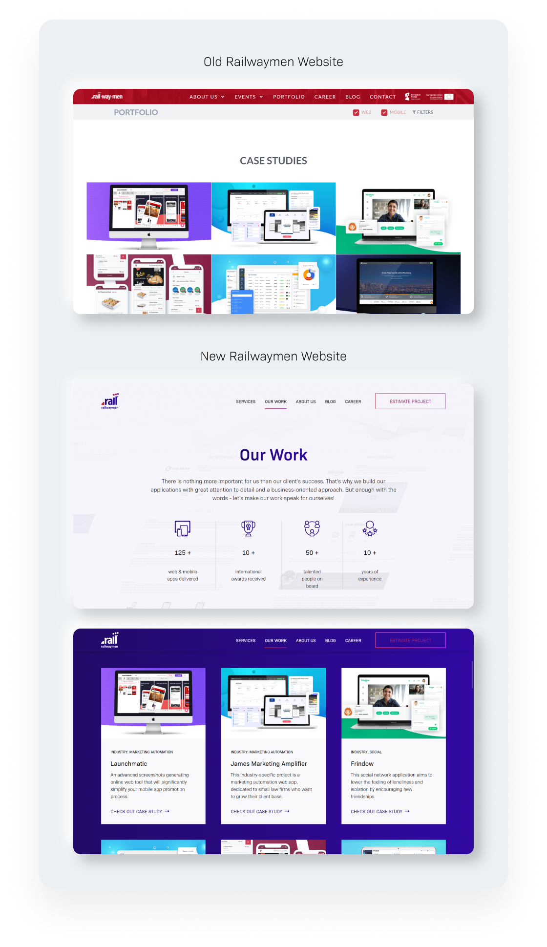 What is worth noticing, that each page on Railwaymen's current website was completely redesigned. They decided to change their visual identity entirely, resigning from strong, red colors and switching them to more sophisticated and toned down violets. The website redesign team was meeting with each other once a week, to discuss what new has been done, and what is planned for the next sprint. The previous/current Railwaymen clients' case studies showed them clearly, that SCRUM methodology will be the most efficient way, to not lose track of the work, and maintain an agile approach.