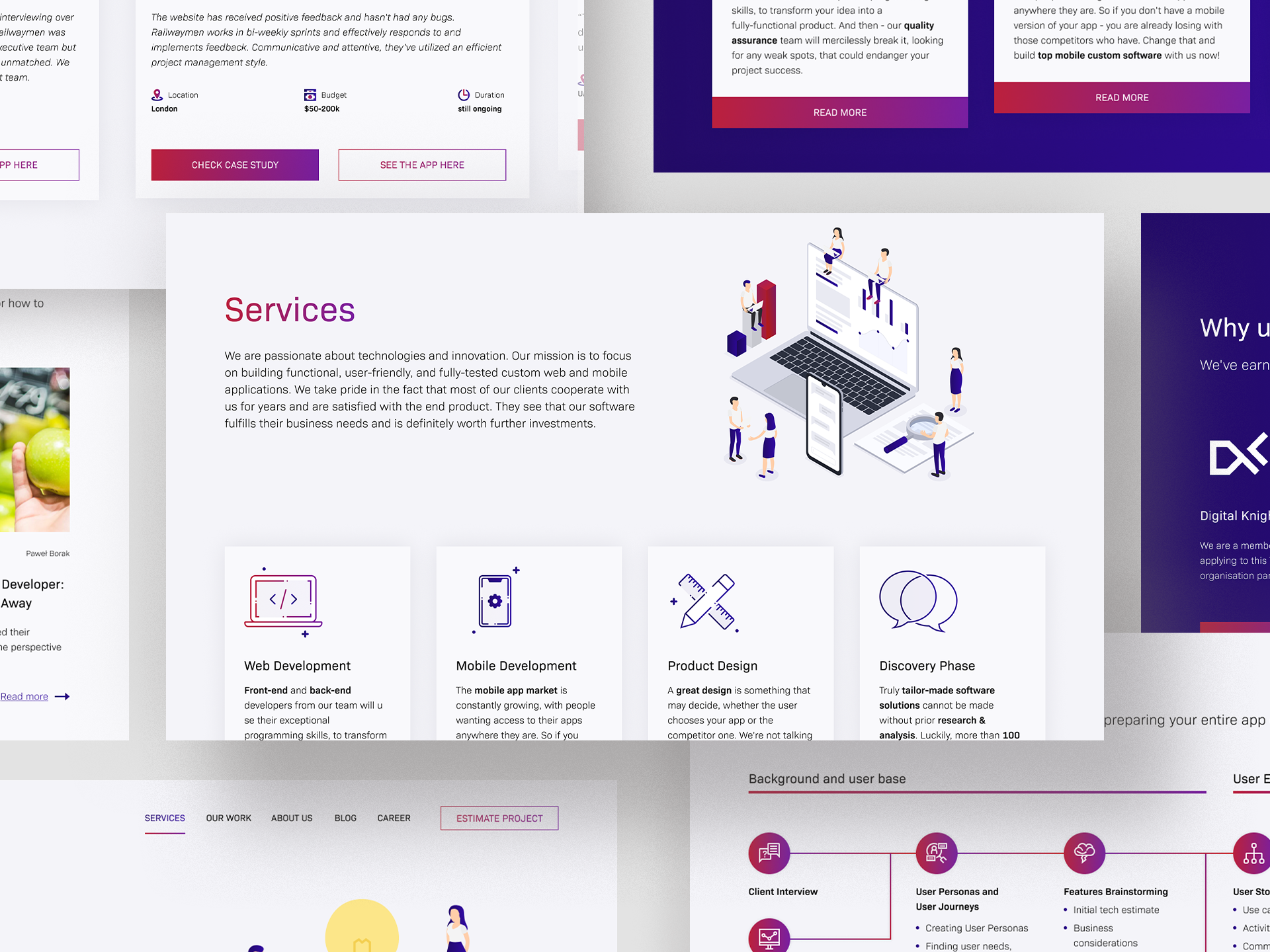 What Railwaymen also took great attention to during their design process is to improve the general user journey. On their old website, there wasn't a dedicated subpage called services, to give a potential client information needed, to consider software development cooperation with this specific company. The services section has been divided into four subsections: Web Development, Mobile Development, Product Design, and Discovery Phase, which emphasize the software house areas of expertize.