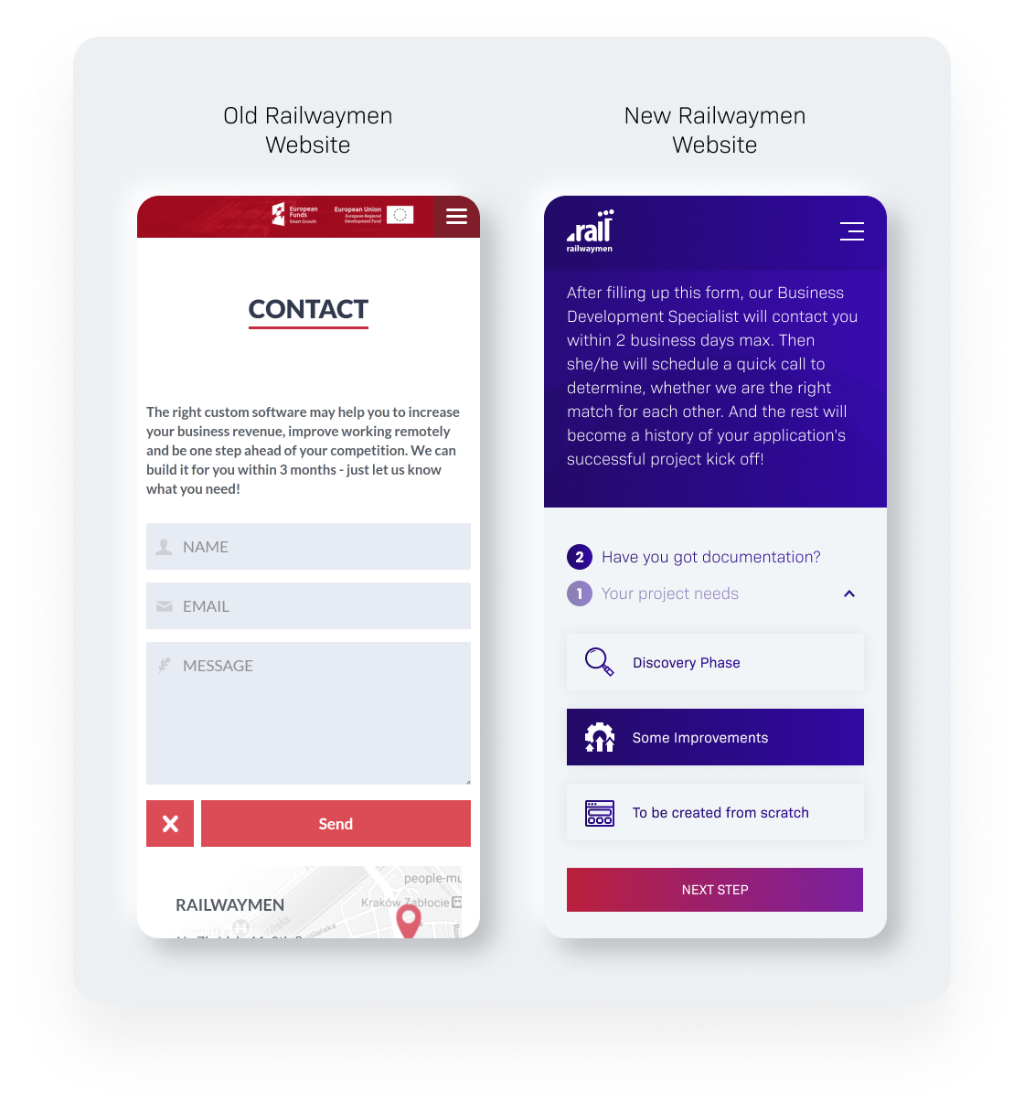In this Railwaymen website redesign case study worth mentioning are the pain points that the software house wanted to eliminate by changing its online appearance. For example, there were multiple contact forms available on the website, which could cause some confusion among company potential clients. Now there is only one Estimate Project form available, which is much more user friendly and easy to fill.
