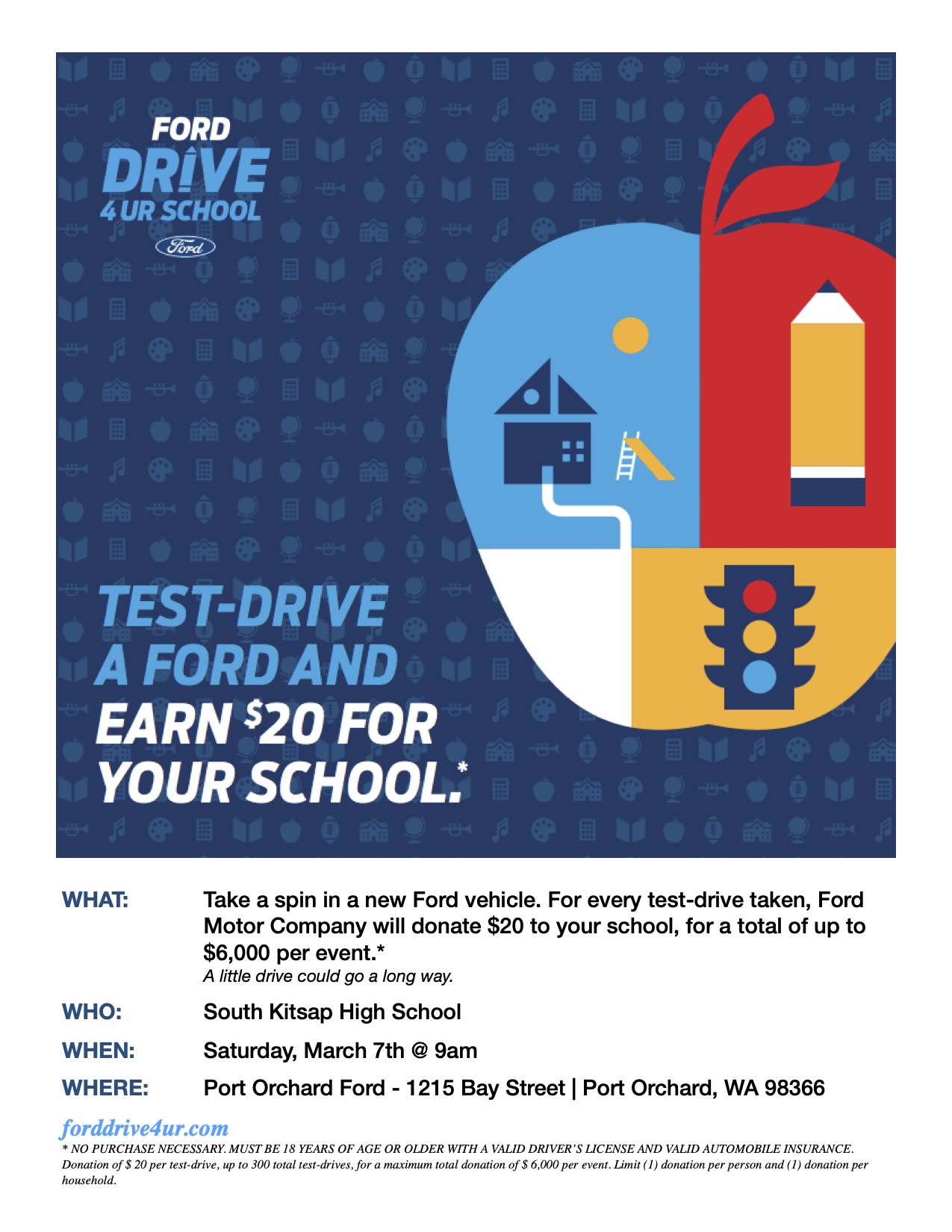 Port Orchard Ford is bringing Ford Motor Company’s Drive 4 UR School program to the Port Orchard community in an effort to raise up to a maximum donation of $6,000 for South Kitsap High School. For every person who test-drives a new Ford vehicle at Port Orchard Ford on Saturday, March 7th, 2020, Ford Motor Company will donate $20 to South Kitsap High School’s Track & Field Team.