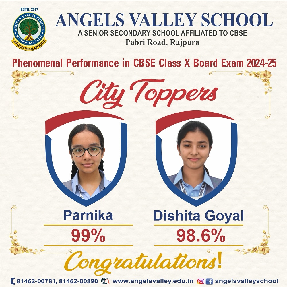 Rajpura, Punjab Jun 18, 2025 (Issuewire.com) - Angels Valley School in Rajpura has announced a significant academic milestone with two of its Class X students securing top positions in the 2025 CBSE Board Examinations. Parnika achieved an outstanding 495 out of 500 marks (99%), while Dishita Goyal closely followed with an impressive 490 out of 500 (98%). These results have positioned them among the highest achievers in the region.
