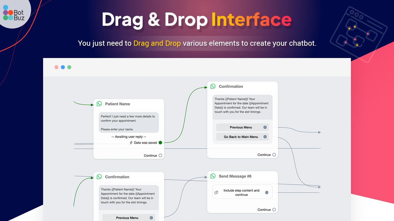 - No coding required: Intuitive drag-and-drop tools to build chatbots without any programming.