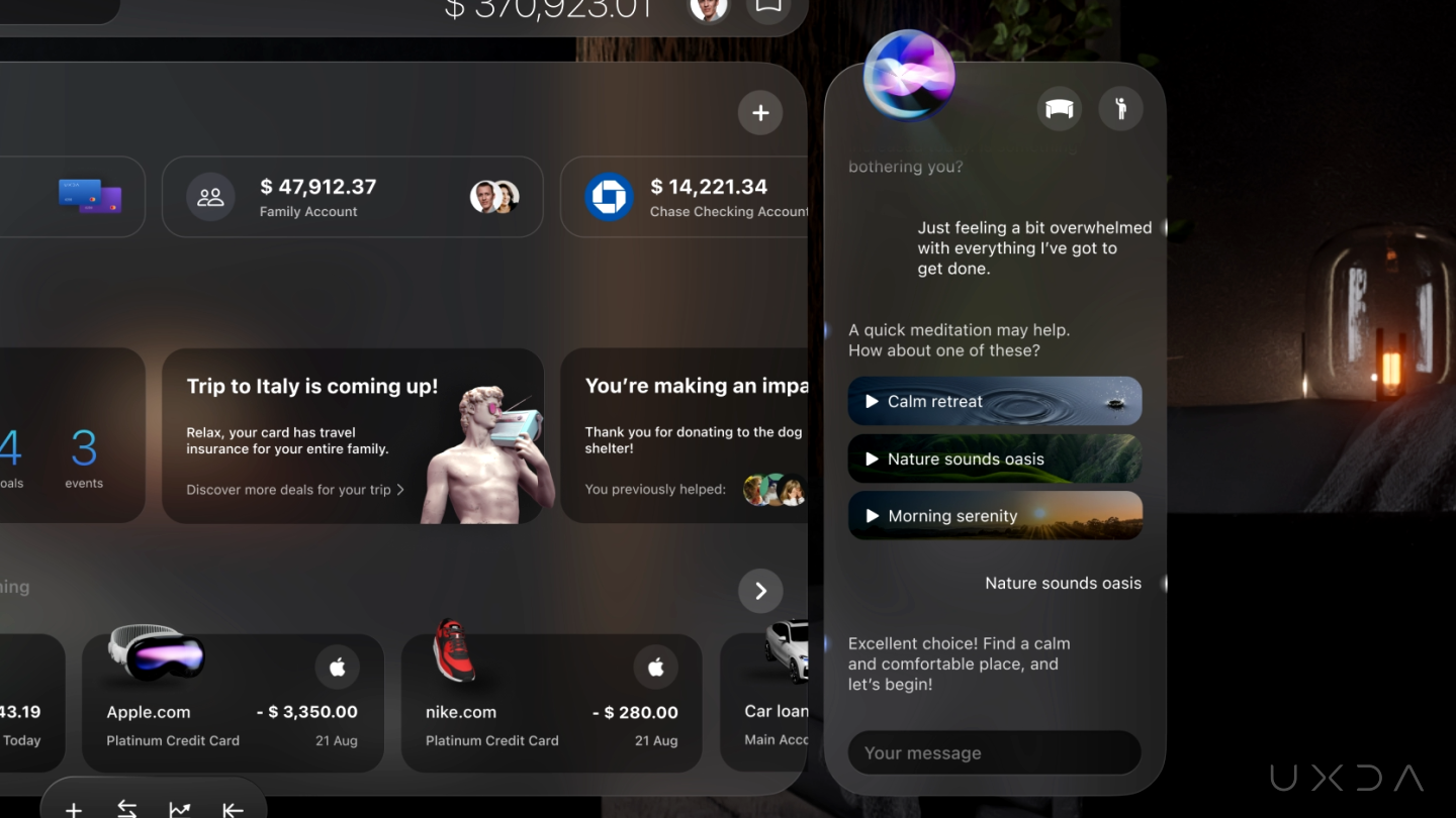 UXDA's AI-powered spatial banking concept provides a glimpse into the future, showing what major banking apps could look like in 2030. UXDA designers imagined a future in which banking is not just a necessity but a seamless, integral part of users' digital and physical lives. By prioritizing user experience and leveraging spatial computing technology by Apple Vision Pro, UXDA is setting the stage for a better future in banking that is more immersive, intuitive, and in tune with digital-native consumers.