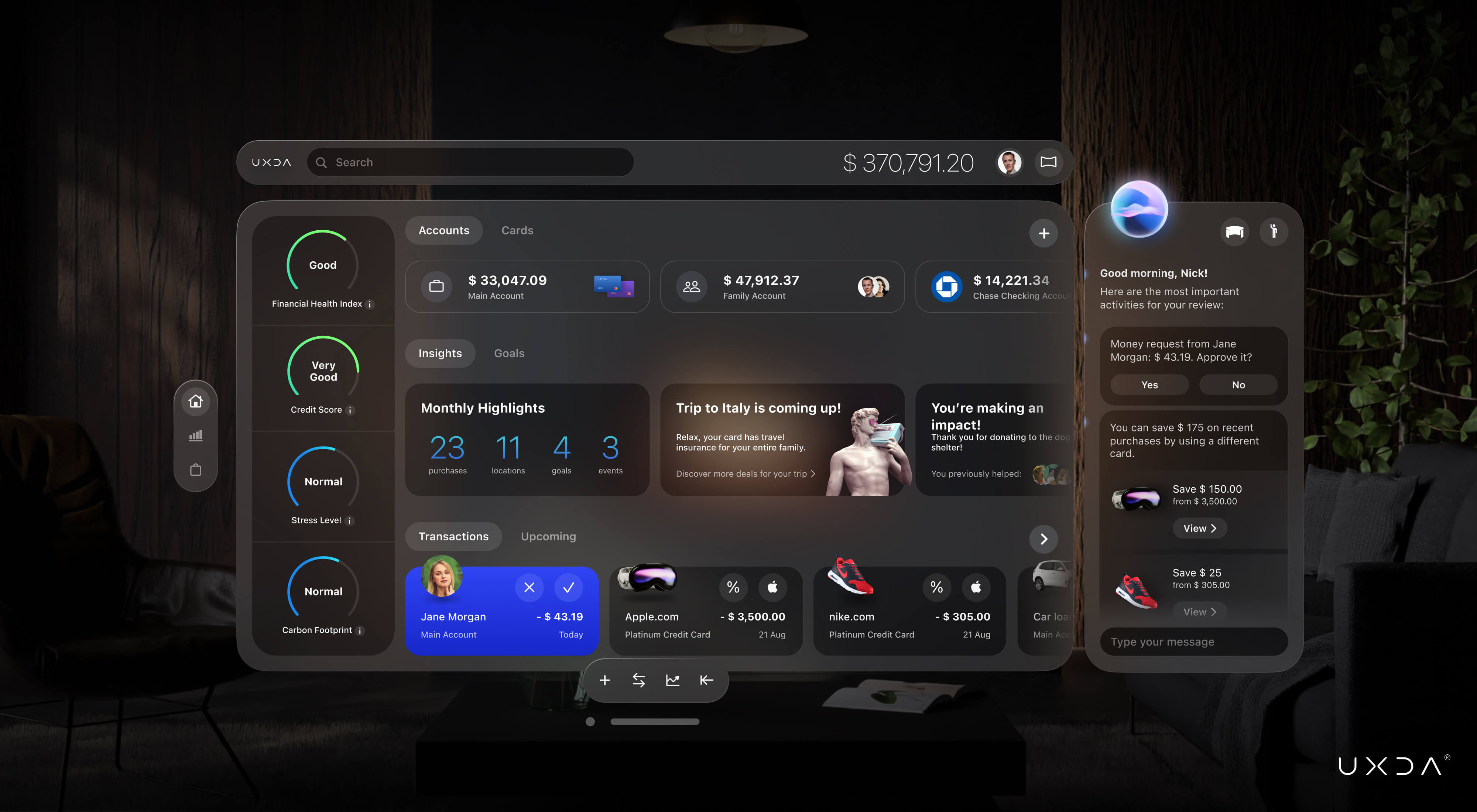 This project prepared the UXDA team to implement a spatial computing user interface into the digital ecosystem of any of the 150 financial products the company served, including Emirates NBD, Garanti BBVA, Bineo by Banorte, United Arab Bank, Bank of Jordan, GCash, and others. The design of the AI-powered spatial banking vision required the UXDA team over 1,000 hours of research, design, and experimentation, resulting in a multi-sensory spatial banking experience that integrates financial snapshots, goals, context analysis, AI guidance, and other features into a future-ready digital solution.