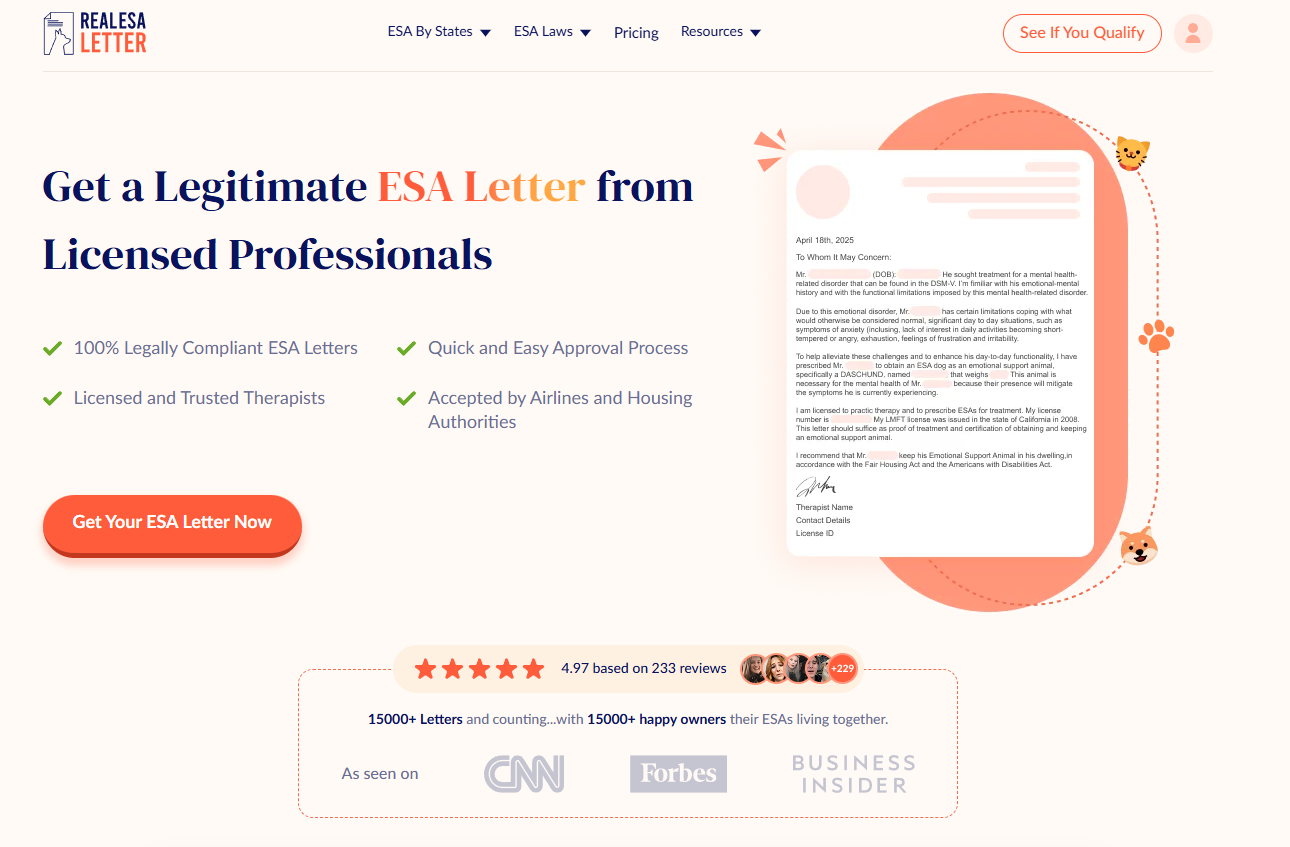 RealESALetter.com is a U.S.-based telehealth platform dedicated to helping individuals improve their mental health through access to emotional support animal letters. All services are backed by licensed therapists, meet federal housing regulations, and follow state laws for legal documentation. With over 15,000 ESA letters issued, Real ESA Letter is a proven and trusted name in the ESA space.