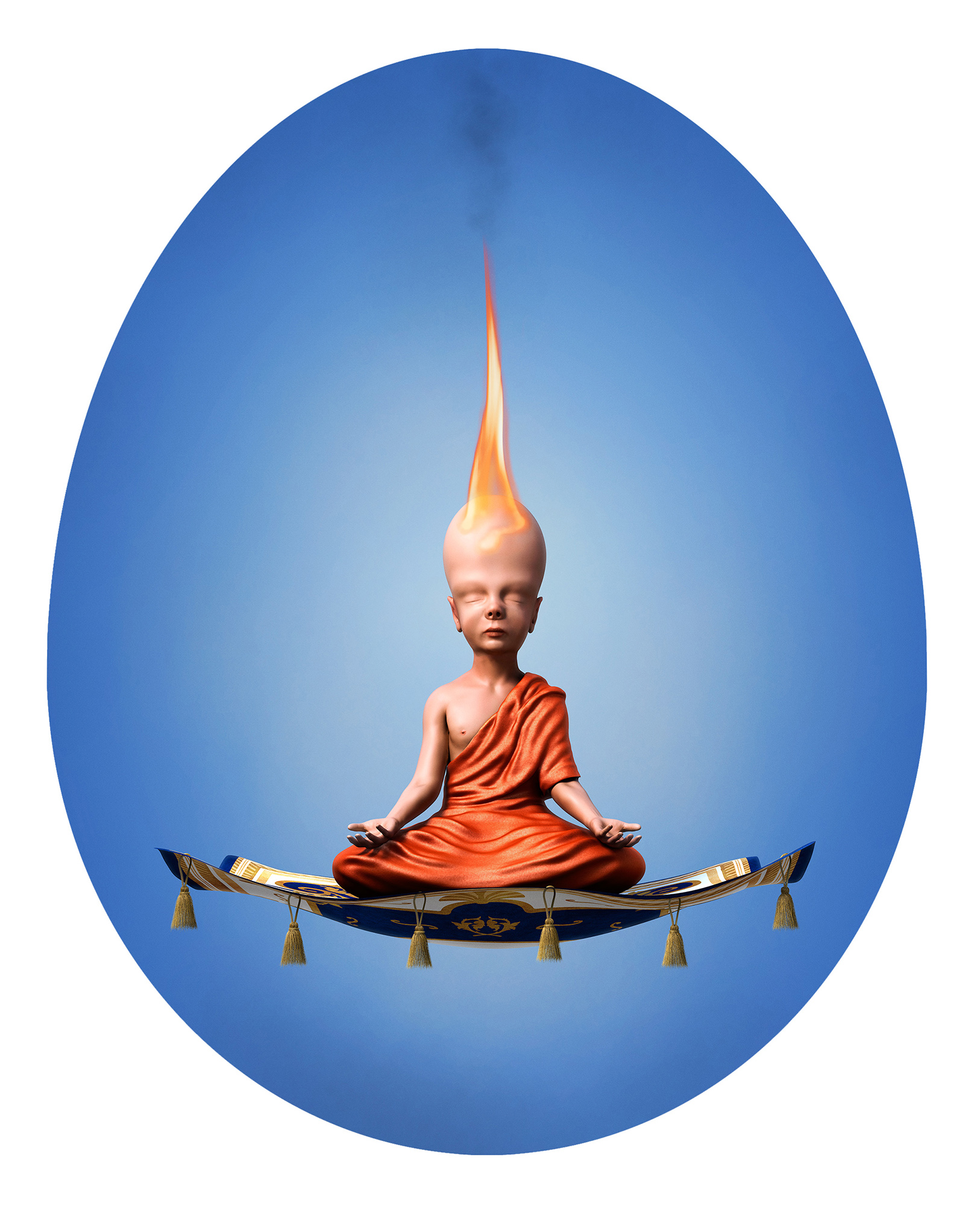 The head of a meditating boy is ignited by a flame, which miraculously does not harm him. Like the burning bush from the Bible and the Torah, this fire must be sacred, causing no harm. The boy seems to possess the ability to levitate like Buddhist monks, but in reality, he receives assistance from a flying carpet.