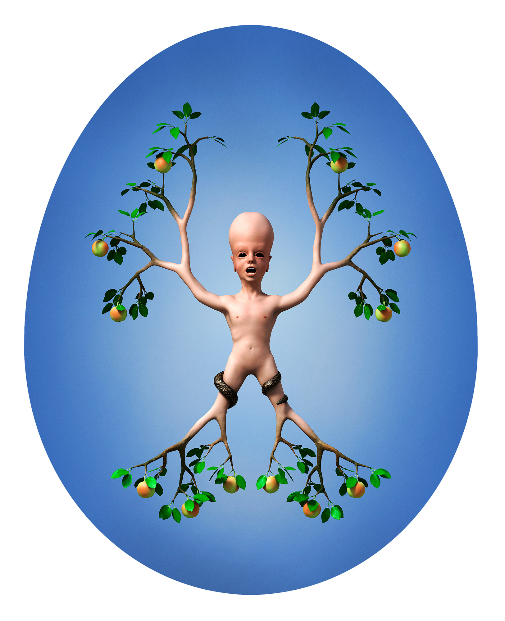 A gender-unspecific child inspired by Greta Thunberg is going green, transforming its limbs into branches. These branches bear apples, and a snake coils around their legs, suggesting that the child has become the tree of knowledge.