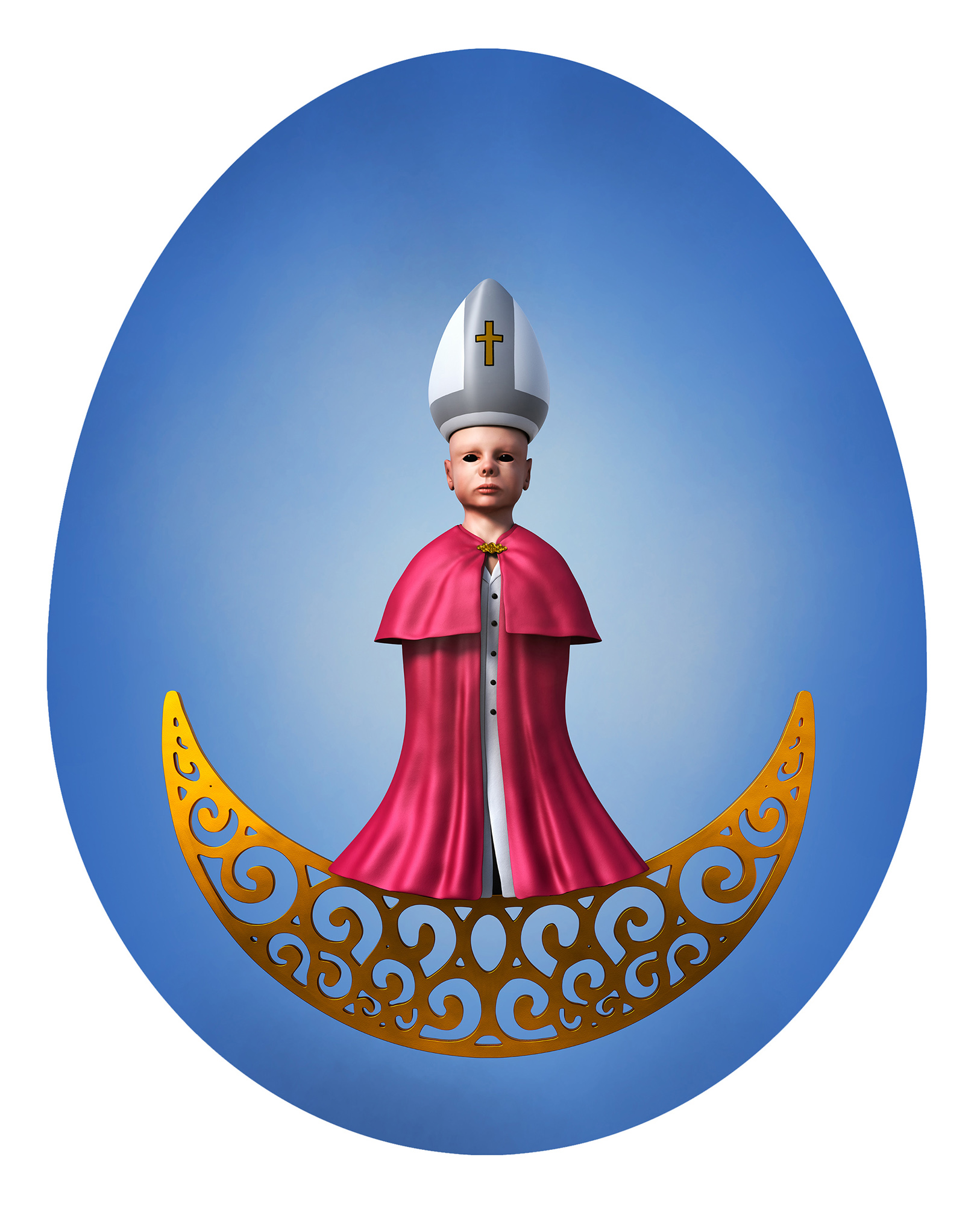 A boy resembling a pope seems to be floating in thin air, but he may actually be resting on an Islamic crescent moon turned 90 degrees.