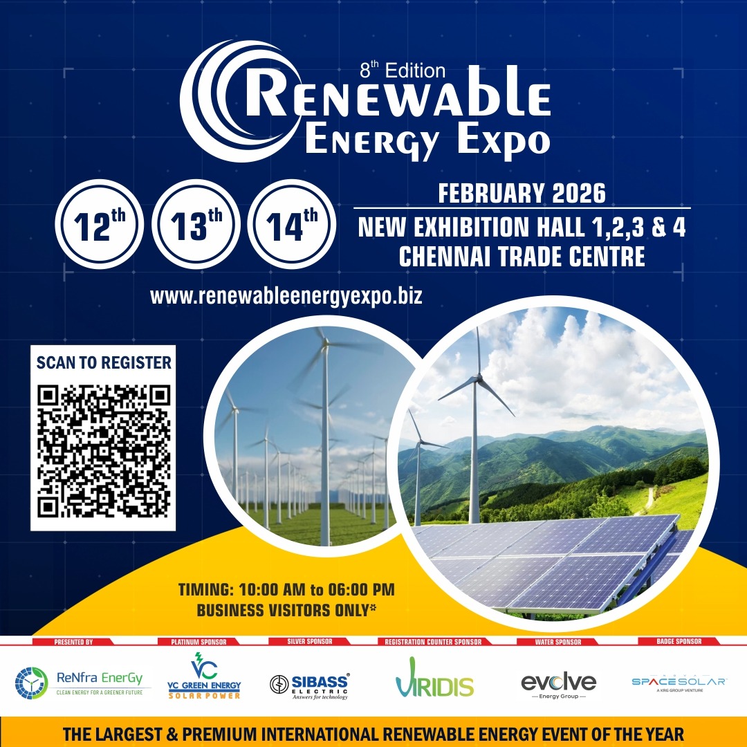 Chennai, Tamil Nadu Feb 1, 2026 (Issuewire.com) - With India’s clean energy transition gaining accelerated momentum, the Renewable Energy Expo 2026 is set to take place from 12 to 14 February 2026 at the Chennai Trade Centre, offering industries a timely platform to evaluate technologies, form partnerships, and capitalise on emerging opportunities. Organised by Water Today Pvt. Ltd., the 8th edition of the Expo will feature over 200 exhibiting companies and is expected to welcome more than 16,000 business visitors.