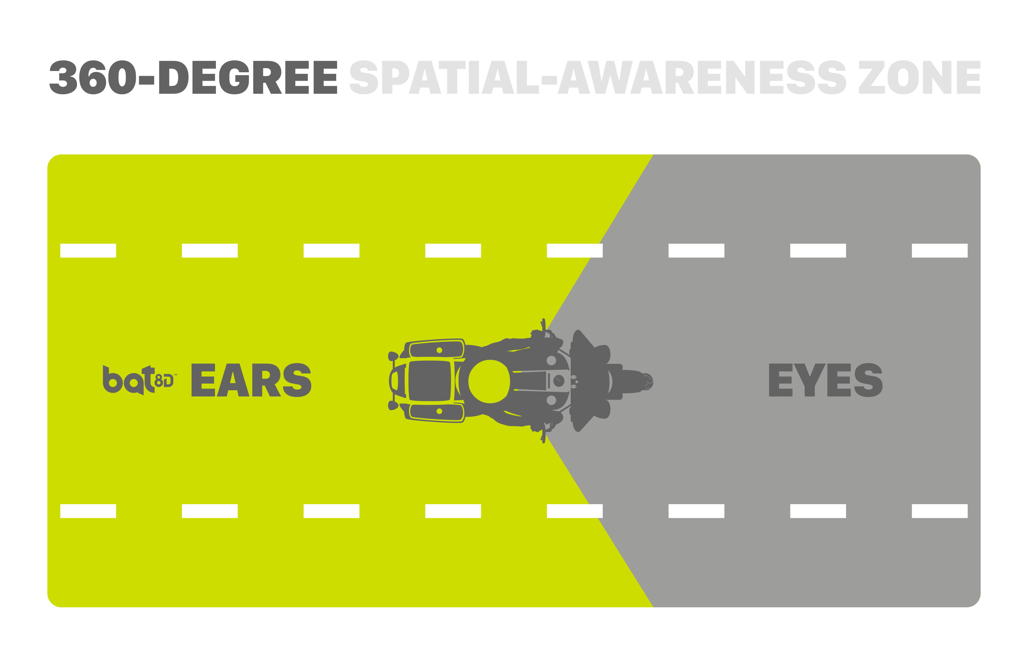 The battery-less and wireless bat 8D™ technology improves awareness significantly while riding with a helmet covering your ears. Re-connect with your surrounding riding environment.