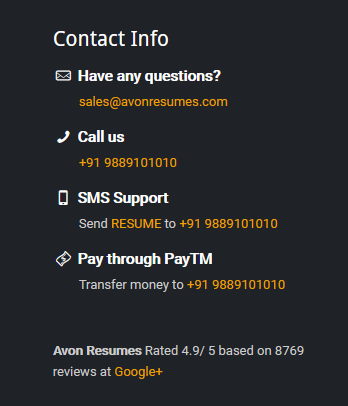 Simply put, if you’re looking for a credible resume writing agency that prioritizes results over gaining a profit from its struggling job-hunting customers, Avon Resumes is sure to serve you well. You can contact them at sales@avonresumes.com or call at +91 9889-101010.