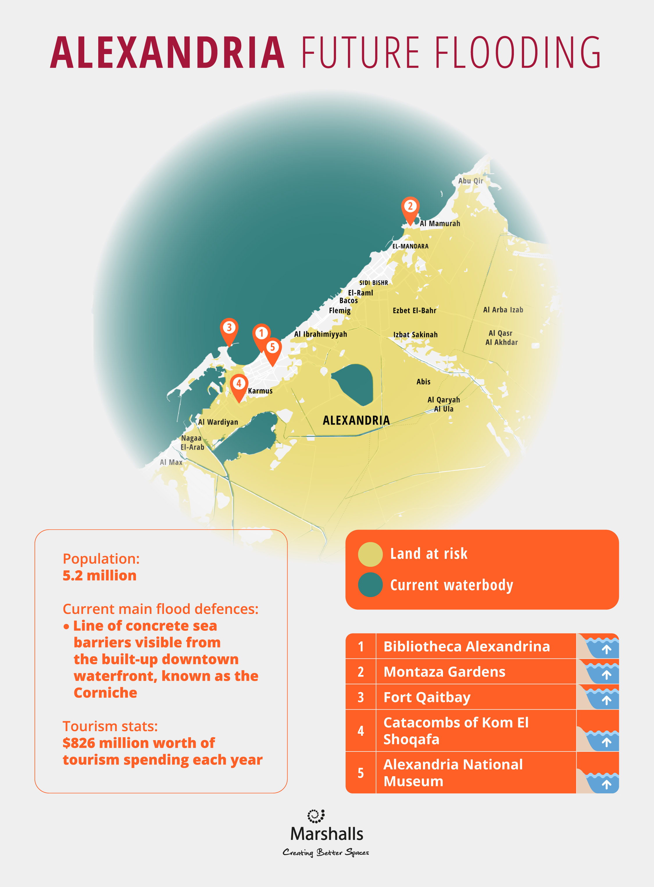 Alexandria in Egypt holds some of the most staggering historical sites for tourists to visit, however, the research shows that over half of the most significant tourist hot spots are at risk of being irrevocably damaged through flooding. With the Montaza Gardens, Fort Qaitbay, the Catacombs of Kom El Shoqafa and the Alexandra National Museum all showing as being within the flood risk zone, the $826 million dollars’ worth of tourism spending will be at risk alongside the multitude of artifacts and buildings at risk of damage. The 5.2 million population of Alexandra are regularly met with floods due to the rising sea levels and sinking of the Nile delta, which can have devasting effects on building foundations. Whilst the large line of concrete seas barriers known as the Corniche is designed to protect the city from the effect of rising sea levels, with the accelerated sea-level rise combined with the overall sinking, the predicted land at risk has shown highlights the need for further work.