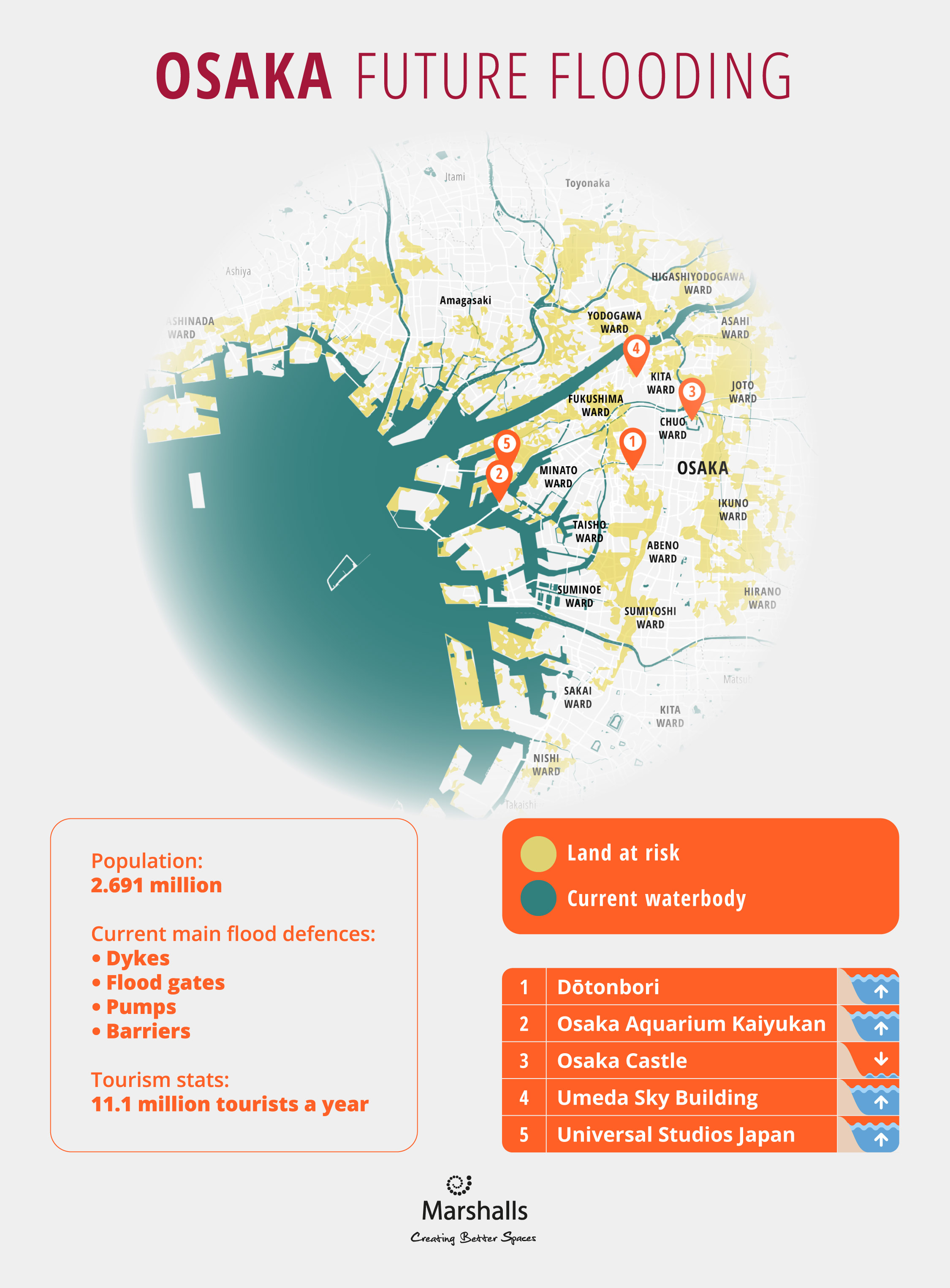 Following just behind Shanghai is the Japanese port of Osaka, which shows 80% of key tourist attractions being at risk of flooding within the next 50 years. With attractions such as Dōtonbori, Osaka Aquarium Kaiyukan and Universal Studios Japan all showing as, within the flood risk zone, the city is in danger of losing the estimated 11 million tourists who visit the region each year. Whilst the port already employs a mixture of dykes, flood gates, pumps and barriers to help fight against flooding, the risk of rising sea levels would leave the majority of these requiring updates to battle the increased high tides.