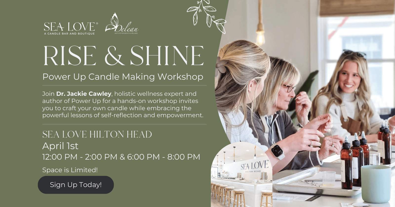 Hosted at the elegant Sea Love | A Candle Bar and Boutique in Hilton Head, this exceptional workshop will be hosted by Dr. Jackie Cawley, renowned holistic wellness expert and author of Power Up.