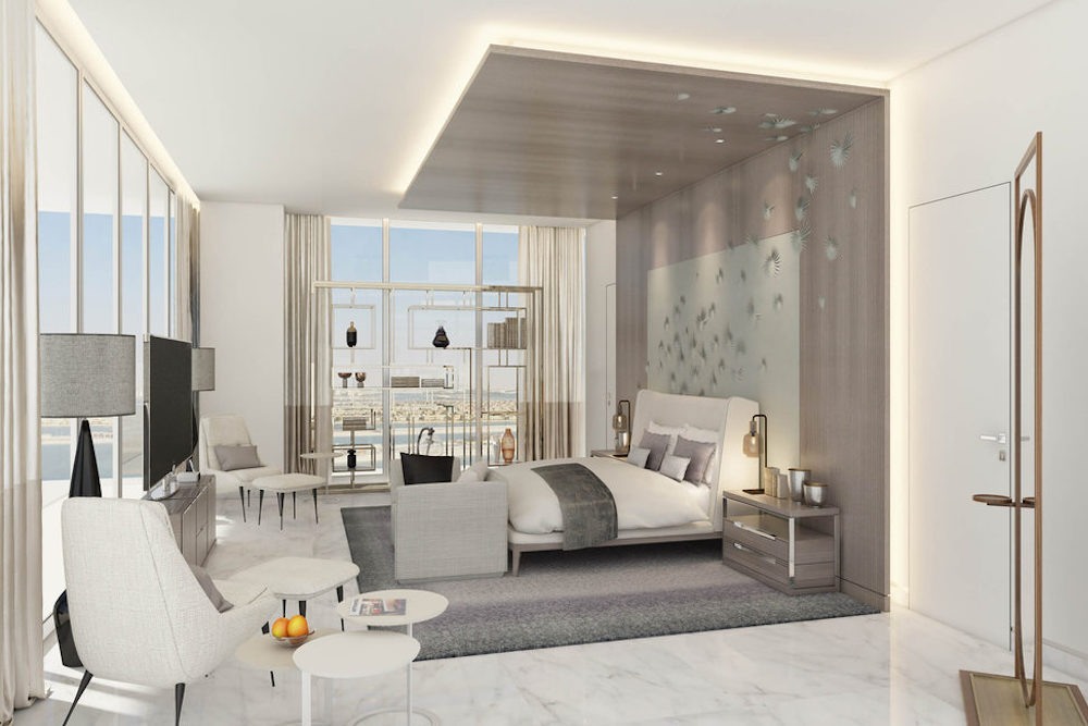 The interior designer Sybille De Margerie Design of Paris has commissioned talented artists to create unique works in materials ranging from leather, metal, and porcelain to glass and gold leaf. Their innovative techniques and intricate artistry enhance the sumptuous interiors of the Royal Atlantis. An exquisite collection of 231 ultra-luxury residences features glass corners in the living room, bedroom, and bathroom, so the residents can enjoy 180-degree spectacular views of The Palm, The Gulf Coast, and Dubai Skyline.