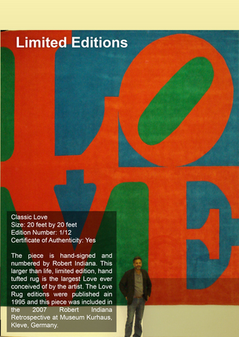 Rugs & Riches successfully achieves a milestone by making this limited edition LOVE custom hand-tufted rug. The piece is hand-signed and numbered by Robert Indiana himself. The larger-than-life (20 feet by 20 feet) limited edition hand-tufted rug is the largest LOVE ever conceived by the artist. The love rug editions were published in 1995 and this piece was included in the 2007 Robert Indiana Retrospective at Museum Kurhaus, Kleve, Germany.