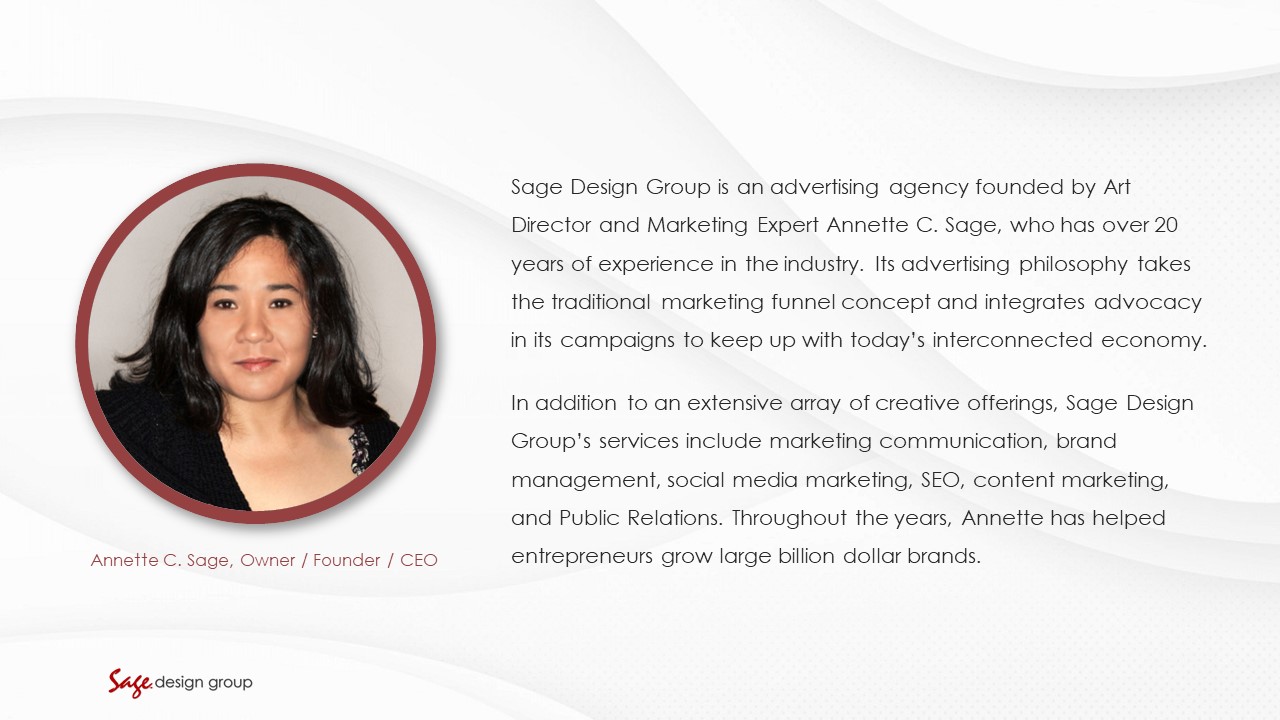Our STORY: Sage Design Group is an advertising agency founded in 2005 by Art Director & Marketing Expert Annette C. Sage, who has over 20 years of experience in the industry. Its advertising philosophy takes the traditional marketing funnel and integrates advocacy to keep up with today's connected economy.