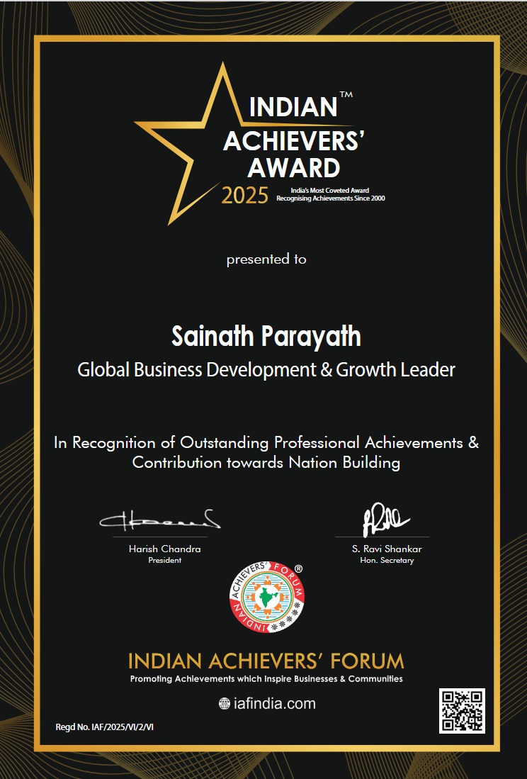 The Indian Achievers’ Forum has conferred the Indian Achievers’ Award 2025 upon Sainath Parayath, recognizing his outstanding contribution in the field of Global Business Development & Growth Leadership. This prestigious recognition celebrates professionals who have demonstrated exceptional leadership, innovation, and impact in driving business success across borders.