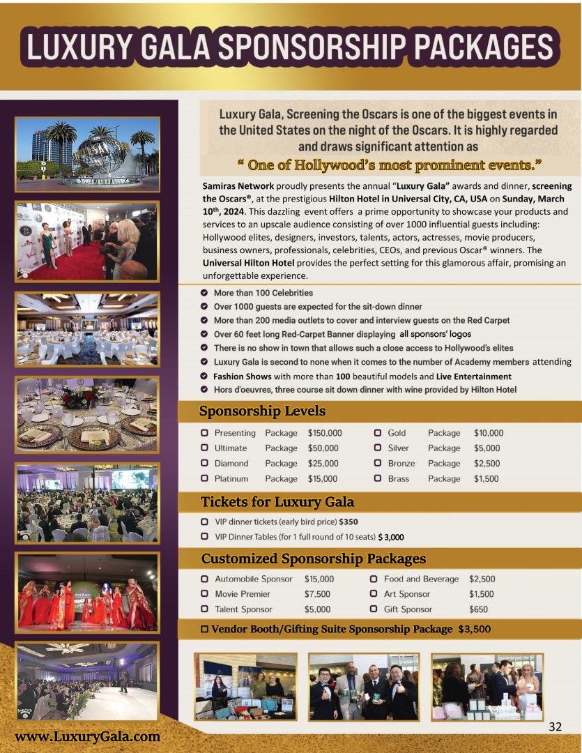 Previous Success: Samira’s Network has a proven track record of hosting exceptional events. The 2023 Luxury Gala, held on March 12, 2023, at the Hilton Hotel in Universal City, was a resounding success. With over 1,000 guests, including 100+ celebrities, business leaders, press, and social media influencers in attendance, the night was a testament to glamour and entertainment. Guests enjoyed a celebrity-filled red carpet, culinary delights, a 3-course dinner, and an electrifying after-party.