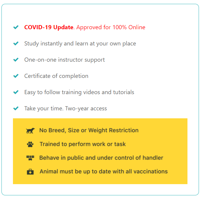 As the course is online, there is no limitation of location or time, the course can be taken at the wanted speed. All methods employed in SDTSI ‘s psychiatric service dog training sessions are animal friendly, easy to follow, and effective. After the completion of the course, SDTSI will provide a dog certification that attests to the completion of the training and a service dog identification kit, which includes a vest, ID, and book.