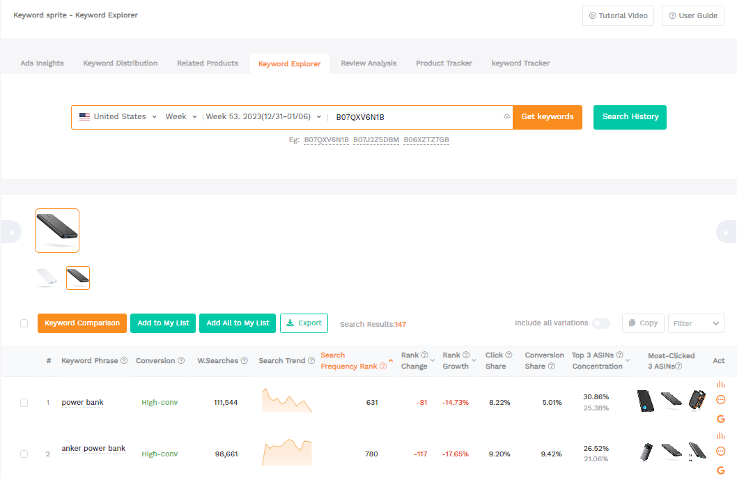 - Keyword Explorer: Utilizing Amazon's Brand Analytics, this tool reveals top-performing keywords associated with specific ASINs, enhancing listing optimization and advertising strategies.