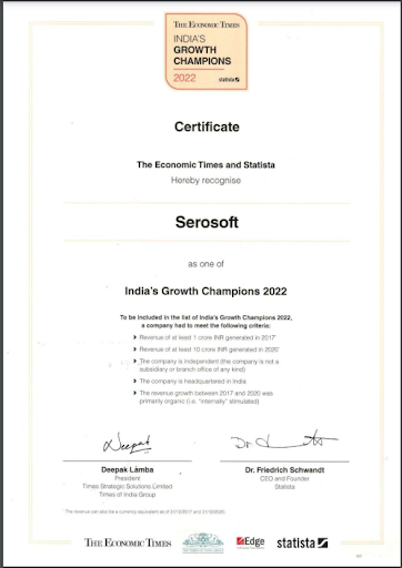 Indore, Madhya Pradesh Jul 15, 2022 (Issuewire.com) - Serosoft, for the 3rd time in a row, has been recognized as the growth champion in India by the Economic Times.