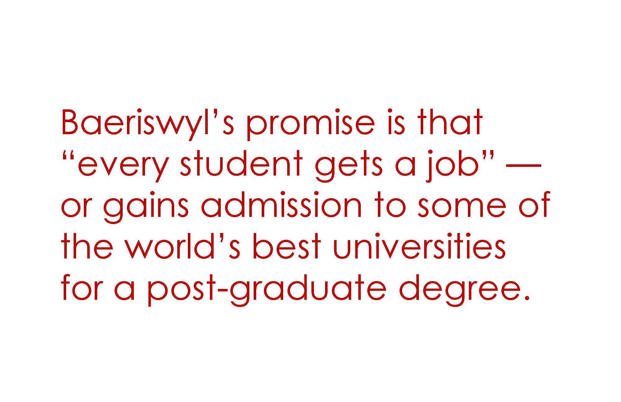 Baeriswyl's promise is that every student gets a job — or gains admission to some of the world's best universities for a post-graduate degree.