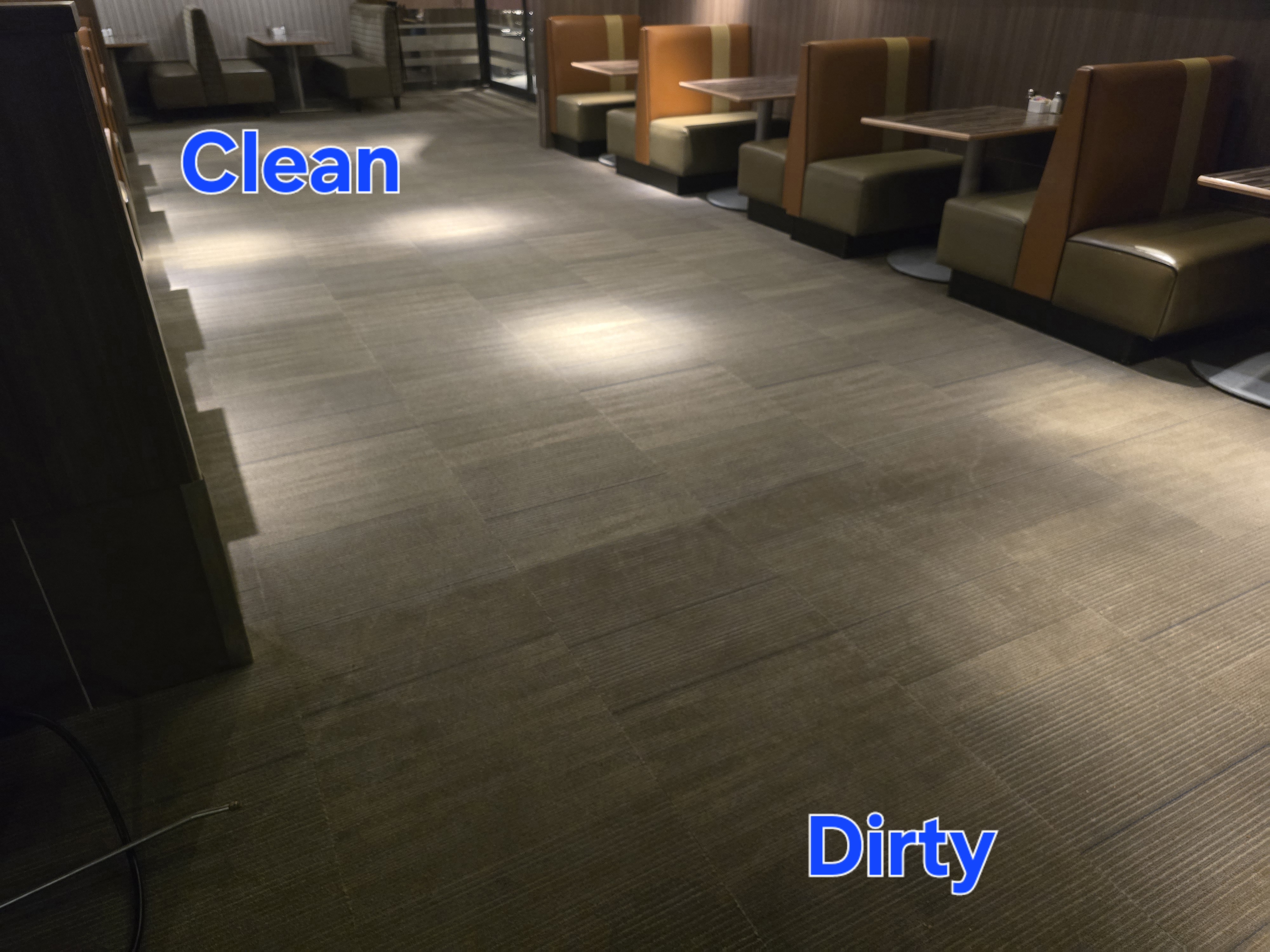 Agitation: Using counter-rotating brushes, we agitate the surface to reach deep into grout lines and carpet fibers — a step most local companies skip.