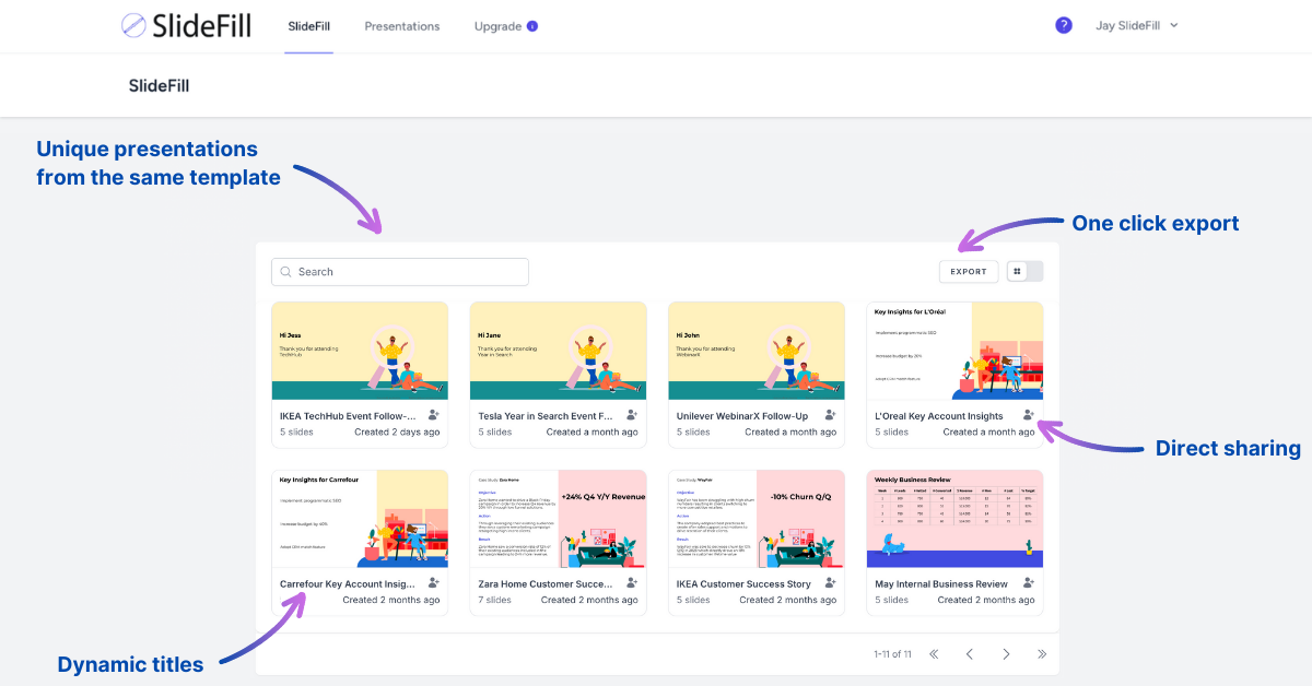 The SlideFill software fully automates the creation of these personalized presentations leveraging your existing data without storing the data on their servers. All content in the presentations can be edited, allowing businesses to be completely on-brand. Organizations can offer their employees their own custom templates with placeholders and SlideFill will fill in the correct data. The app also keeps track of the content created and users can easily share their content with other employees or customers.