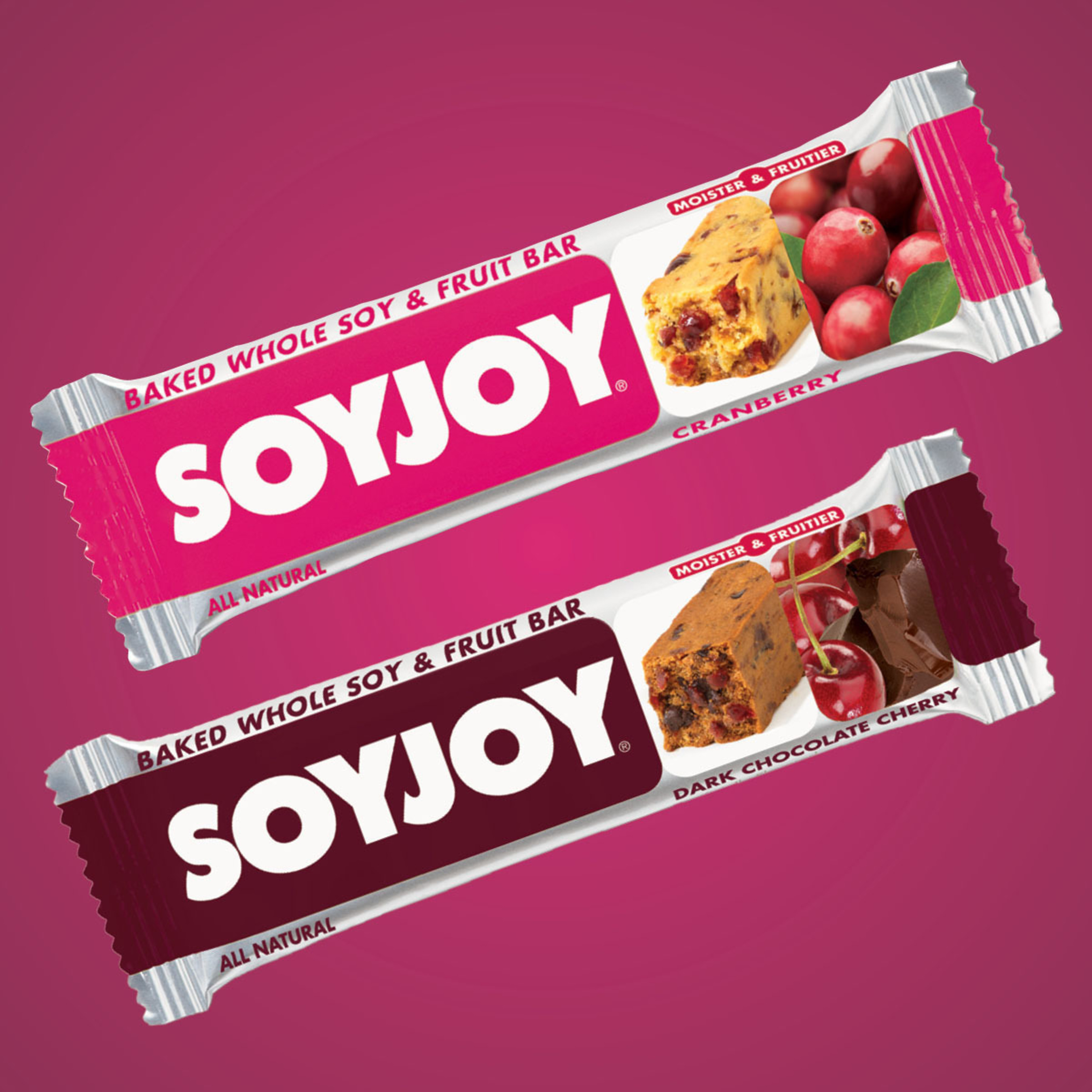 Delightfully tart and bursting with sweetness, Cranberry SOYJOY brings together a combination of all natural ingredients to provide a perfect snack for any time of day. Enjoy it with your morning coffee, during an afternoon snack break, or throw it in your bag for an easy, on-the-go snack that packs nutrition and staying power. Similarly, Dark Chocolate Cherry SOYJOY provides all natural goodness, but with sweet-toothed consumers in mind. The perfect pairing of luscious dark chocolate and tart cherries offers a sensation of indulgence, without the guilt.