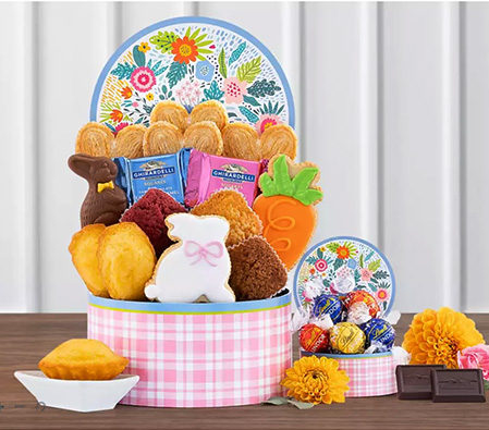 Welcome in the sunshine of the new season with this beautiful gift box overflowing with a collection of Ghirardelli dark chocolate, milk and dark chocolate with caramel, dark chocolate with raspberry, fruit-filled puff pastries, almond tea cookies, fruit jelly candy, raspberry, and madeleine cakes, Lindt milk, and dark chocolate truffles.