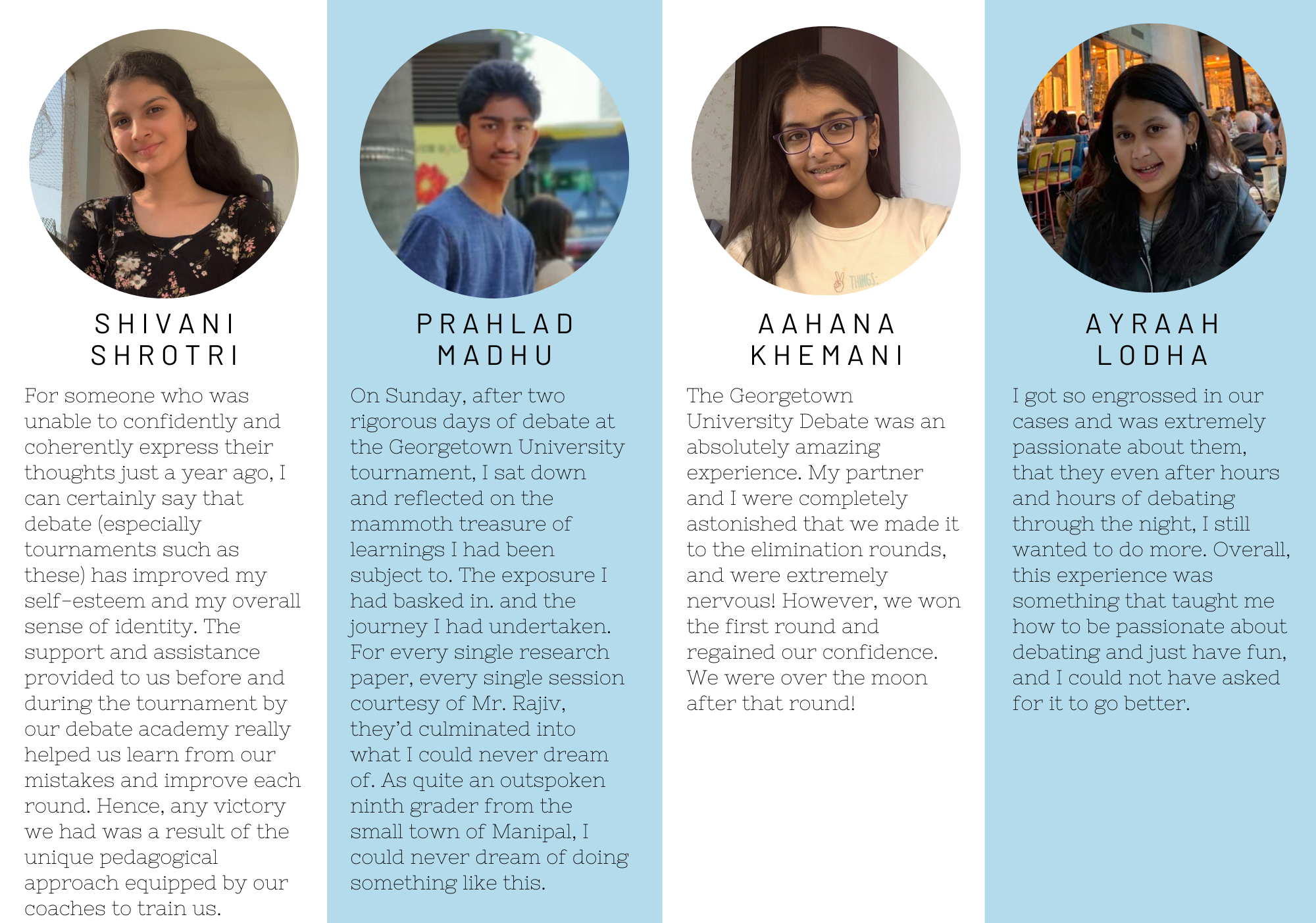 Student perspectives? Here are four of Speech and Debate India’s outstanding Middle School and High School debaters on their experience at the Georgetown University tournament. More student views are available athttps://www.speechdebateindia.com/students