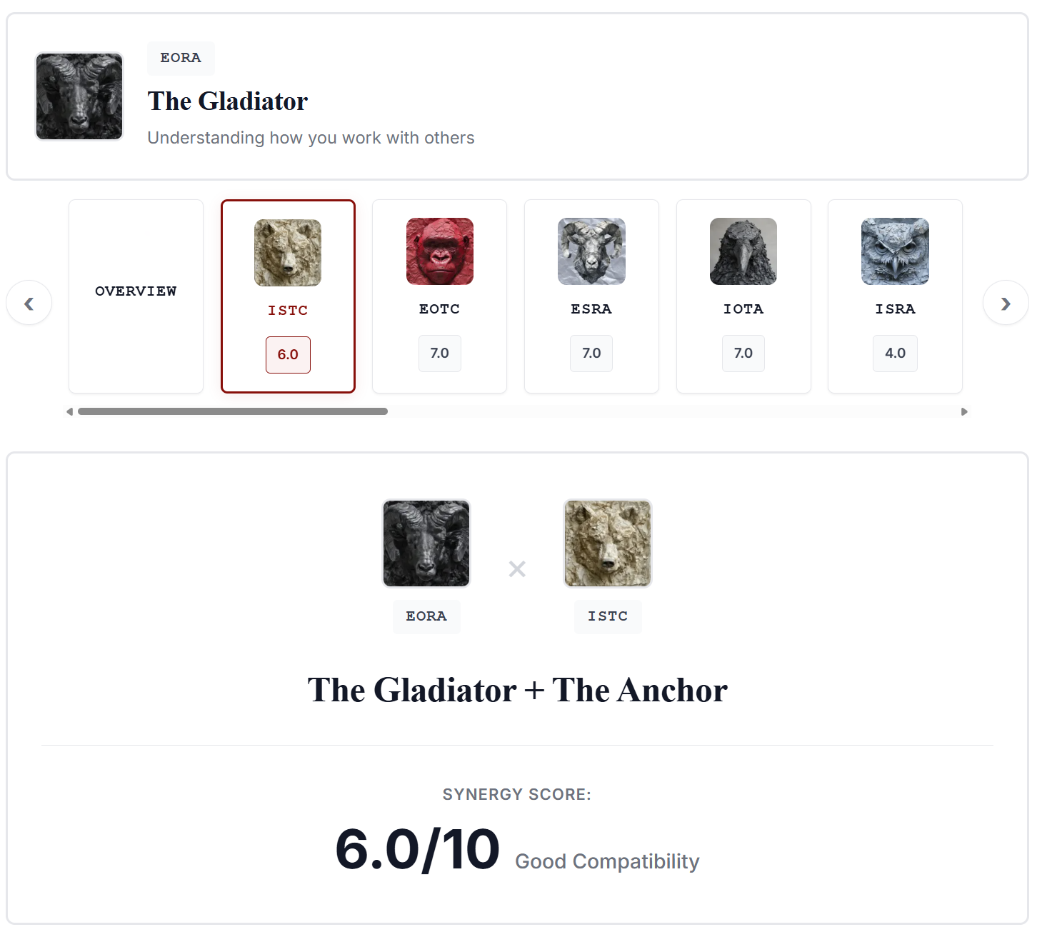 The system translates sport-psychology theory into a practical visualization tool showing how different athlete types interact during training and competition. Each pairing—such as Gladiator and Harmonizer or Purist and Strategist—reveals potential strengths, communication styles, and motivational contrasts that shape team performance.