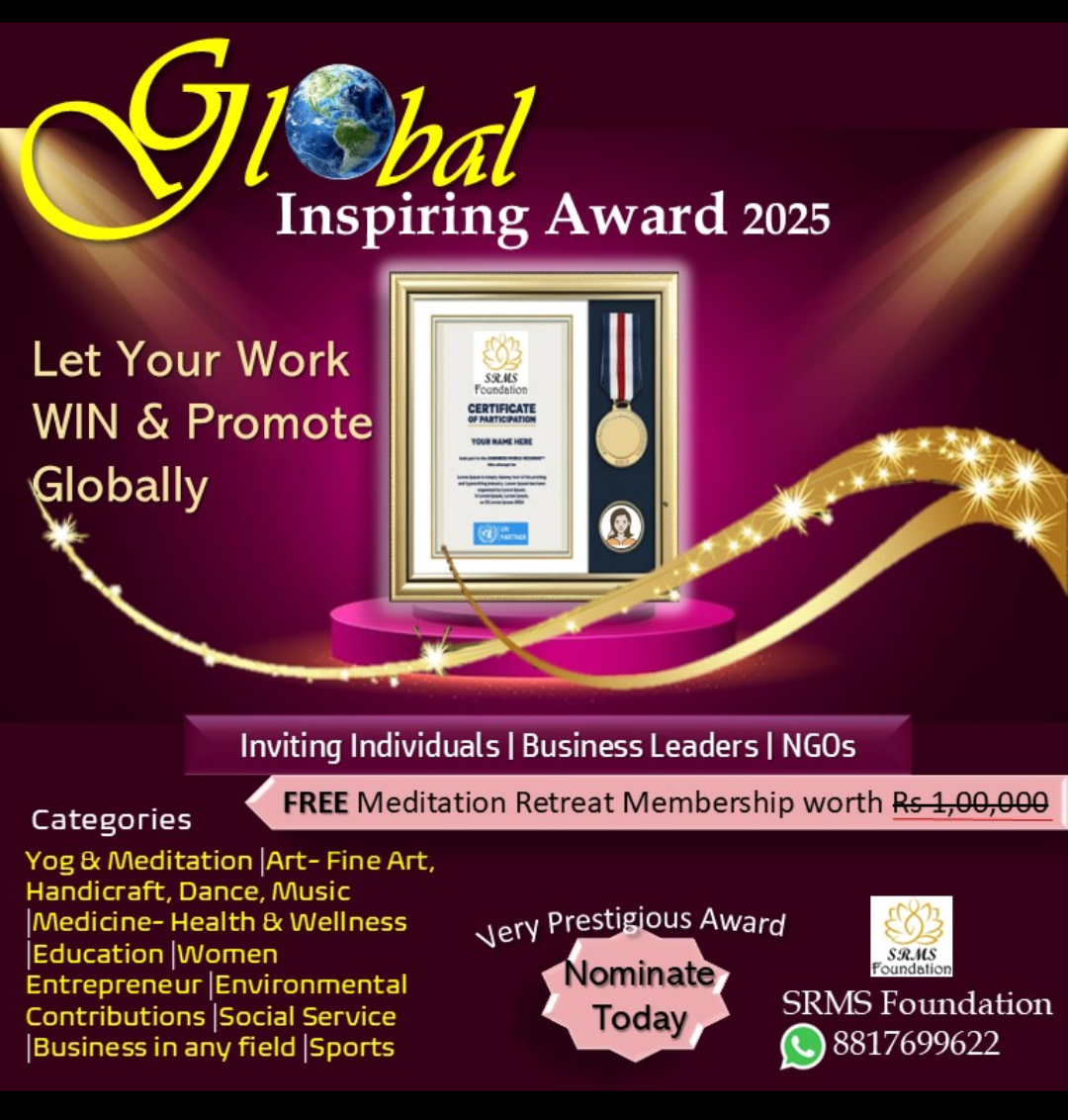 SRMS Foundation is proud to present the *Global Inspiring Awards 2025*, an esteemed platform that recognizes individuals who inspire and lead with purpose. This global recognition honors exceptional individuals from diverse fields who have made a significant impact on society.