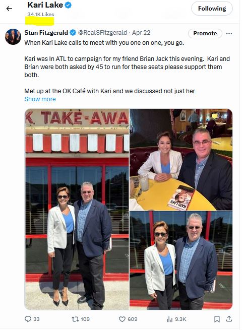 Acworth, Georgia Apr 26, 2024 (Issuewire.com) - On April 22, 2024 Kari Lake invited Stan Fitzgerald to meet with her one on one at the OK Cafe in Atlanta Georgia. Lake was in town to campaign for Trump endorsed Brian Jack for congress in GA3 that evening. Fitzgerald had stepped down from VFAF Veterans for Trump citing attacks on his family on March 24, 2024 but the Lake meeting shows his MAGA political influence still at the top in Georgia. https://stan-fitzgerald.com/kari-lake-calls-stan-fitzgerald-to-meeting-in-georgia/
