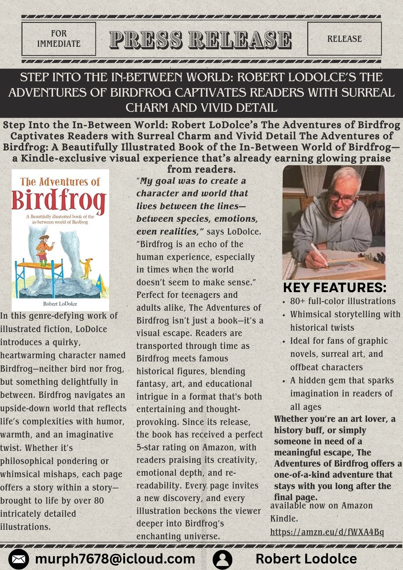 Anniston, Alabama Jun 22, 2025 (Issuewire.com) - In this genre-defying work of illustrated fiction, LoDolce introduces a quirky, heartwarming character named Birdfrog—neither bird nor frog, but something delightfully in between. Birdfrog navigates an upside-down world that reflects life’s complexities with humor, warmth, and an imaginative twist. Whether it’s philosophical pondering or whimsical mishaps, each page offers a story within a story— brought to life by over 80 intricately detailed illustrations. “My goal was to create a character and world that lives between the lines—between species, emotions, even realities,” says LoDolce. “Birdfrog is an echo of the human experience, especially in times when the world doesn’t seem to make sense.”