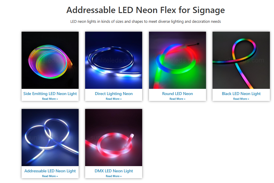 * Flexible LED neon in monochrome, RGB, RGBW, and DMX/SPI-controlled variants—including outdoor IP68 and 360° emitting options