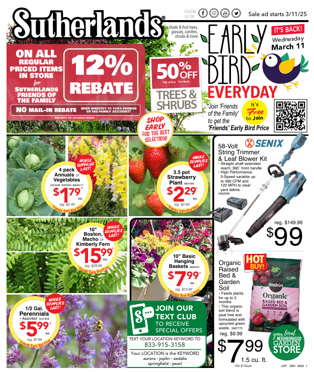 Springfield, Missouri Mar 16, 2026 (Issuewire.com) - Spring is here, and Sutherlands Hardware and Supply Store is making it easier than ever for homeowners and DIY gardeners to get a head start on the season. Sutherlands Hardware & Supply Store is excited to announce its Early Bird Plant Sale, offering customers a wide selection of gardening products, plants, and lawn care essentials designed to help kick off the spring gardening season.