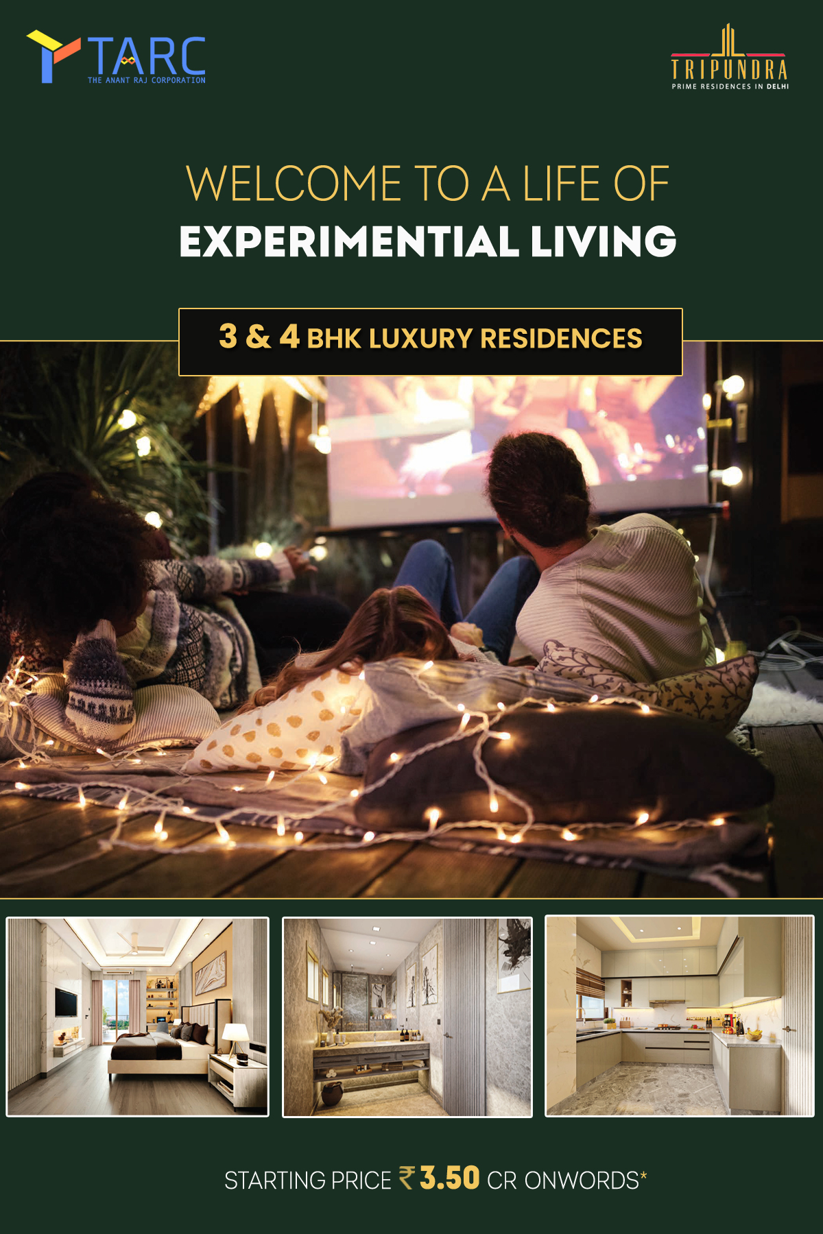 The pristine development of Tarc Tripundra New Delhi spreads across delightful land parcels and offers a charming variety of 3BHK & 4BHK luxury residences that vary in their size. The homes are stylized into majestic towers that glorify the city's skyline. The campus has open spaces that let you socialize with friends and family and also keep your lungs healthy.