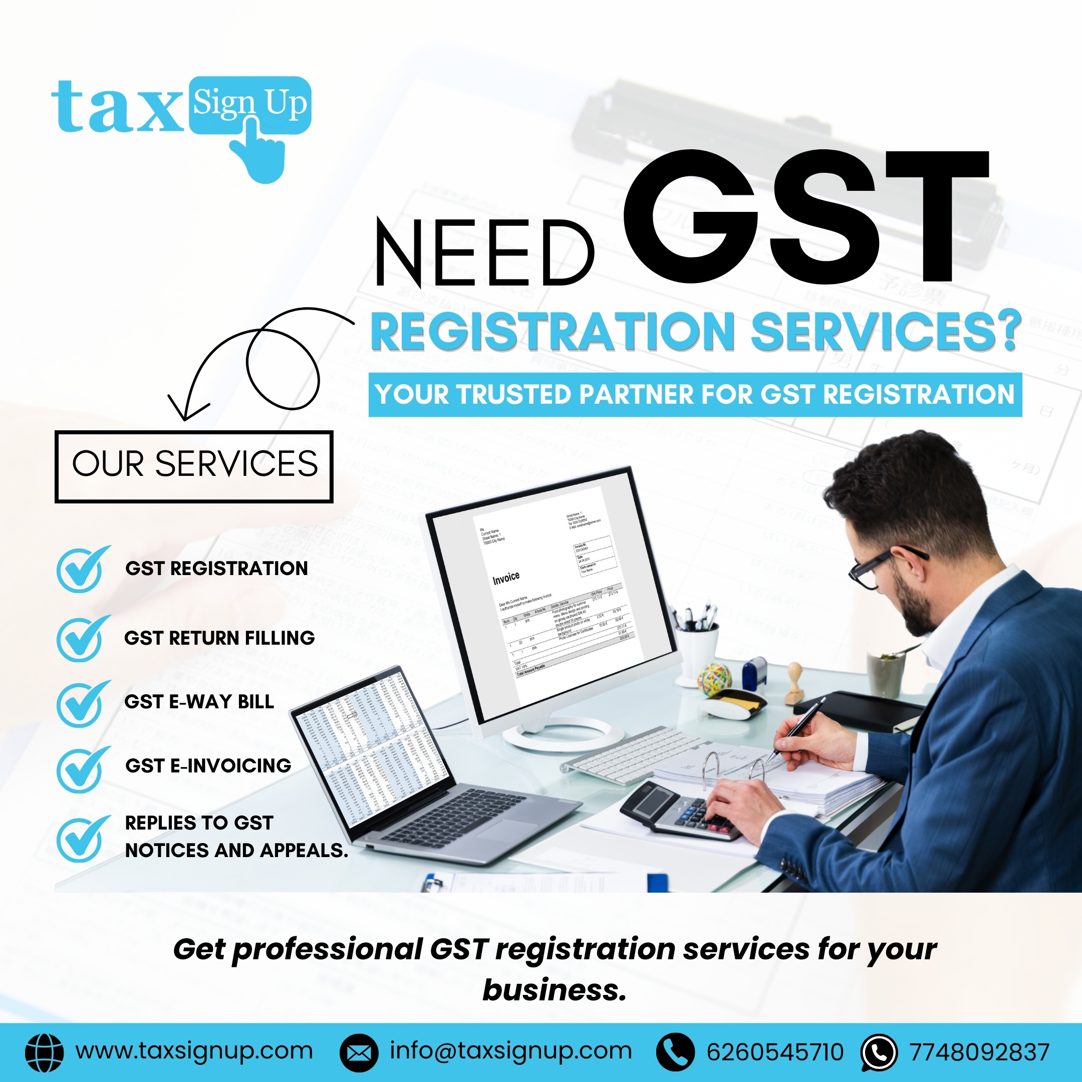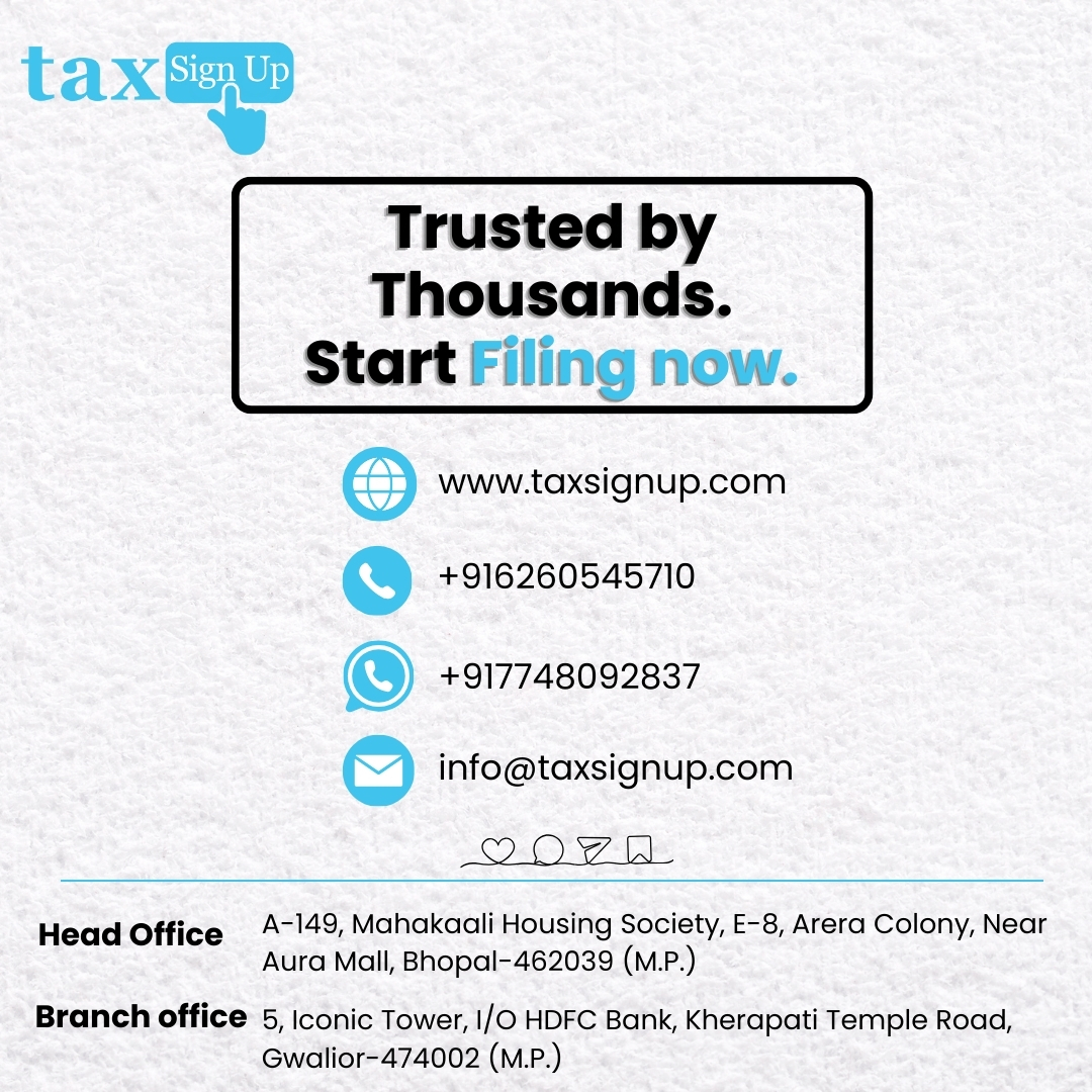 tax-sign-up info@taxsignup.com 09425338631 A-149, Mahakaali Housing Society, E-8, Arera Colony, Near Aura Mall, Bhopal-462039 (M.P.) https://taxsignup.com/