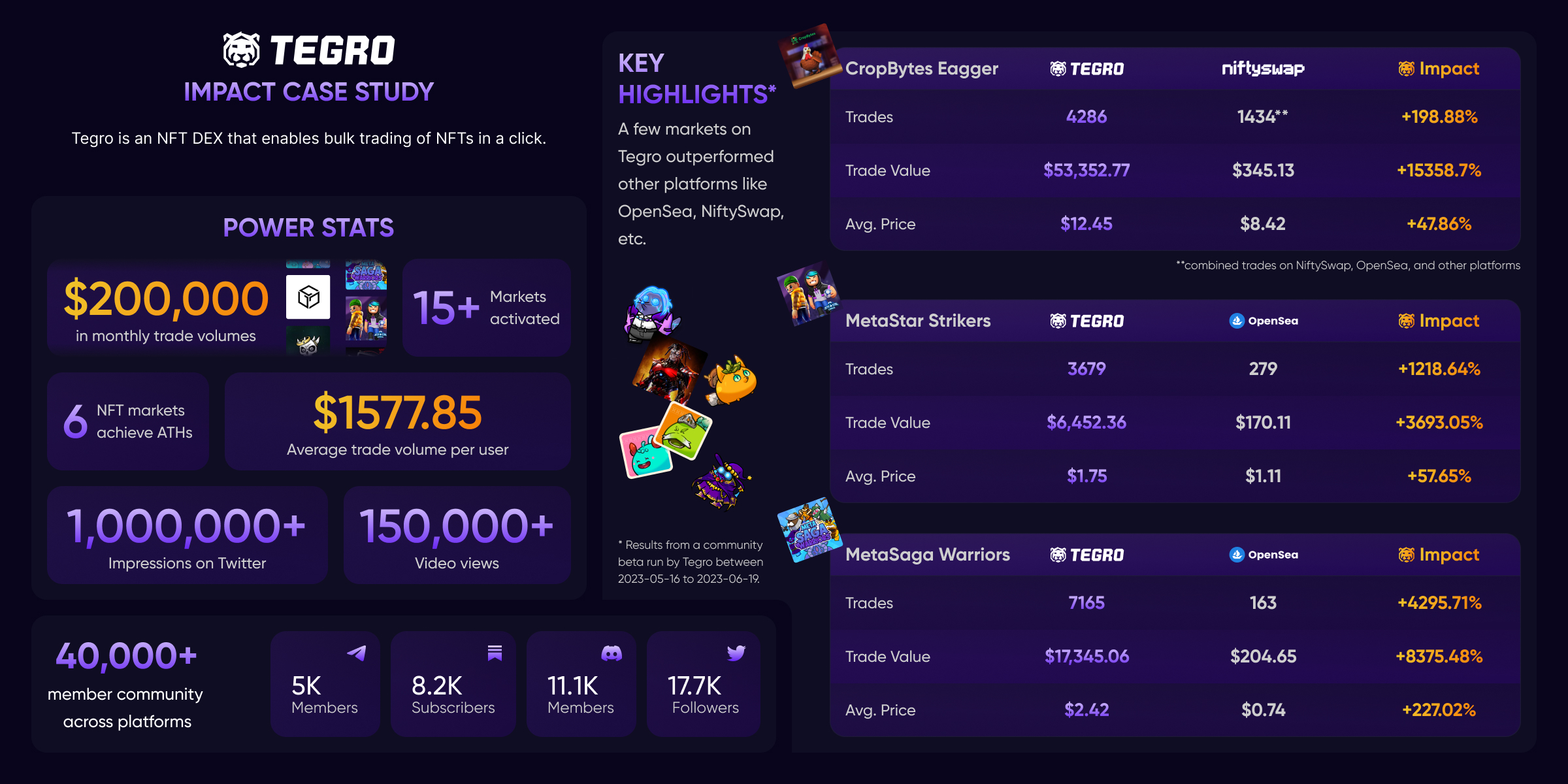 The change follows the completion of a very productive phase one beta, where Tegro accomplished multiple achievements, such as surpassing $200,000 in monthly trade volumes, activating over 15 NFT markets, helping markets like CropBytes, MetaStar Strikers, and MetaSaga Warriors to do 100 times their trading volumes and reach their all-time highs in the bear market, and growing a community of more than 40,000 members. During this period, Tegro also secured seed funding at a $100M valuation from Polygon Ventures and other angel investors.