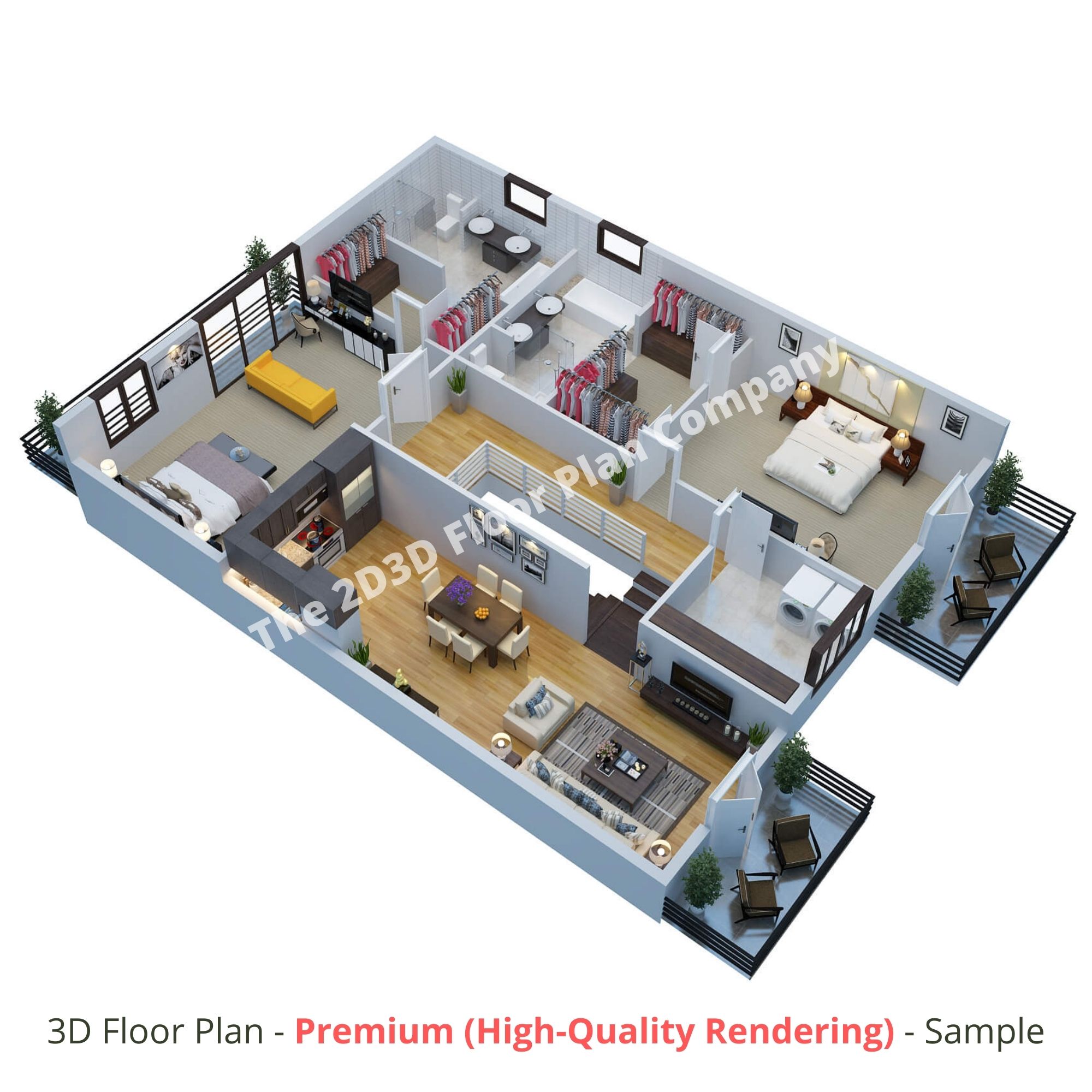 For high-quality rendering (premium option), you can expect the highest possible rendered 3D plan with enhanced-level detailing for finishes (we do use a combination of two (2) software, which is most advanced in the industry; we use 3dsMax for 3D modeling and V-ray software for 3D rendering). These 3D floor plans are much vibrant, photo-realistic and detailed, compared to standard-level rendering.